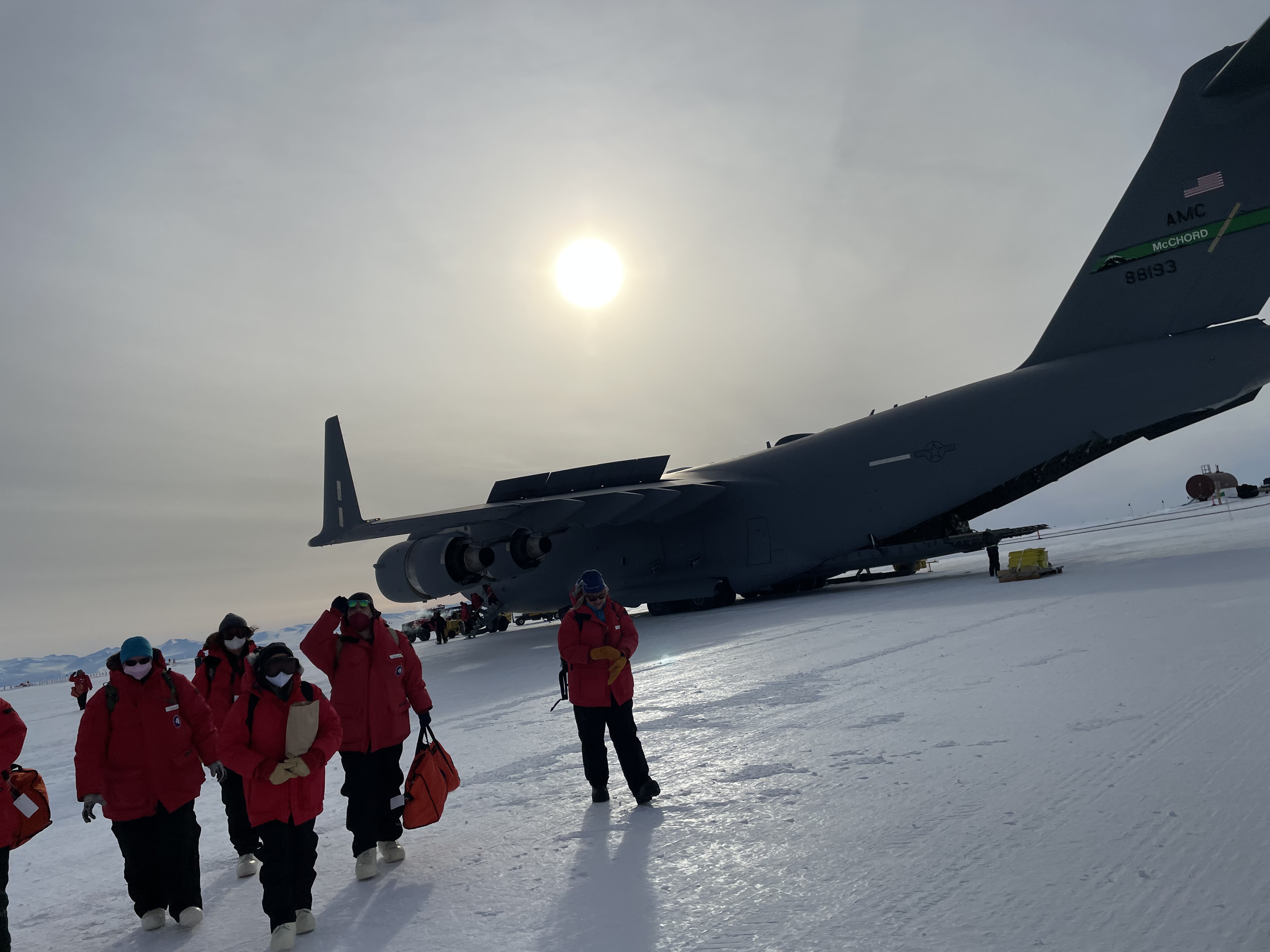 Travellers walk away from the C-17 after it has landed at Willy Airfield. McMurdo Station, Antarctica.