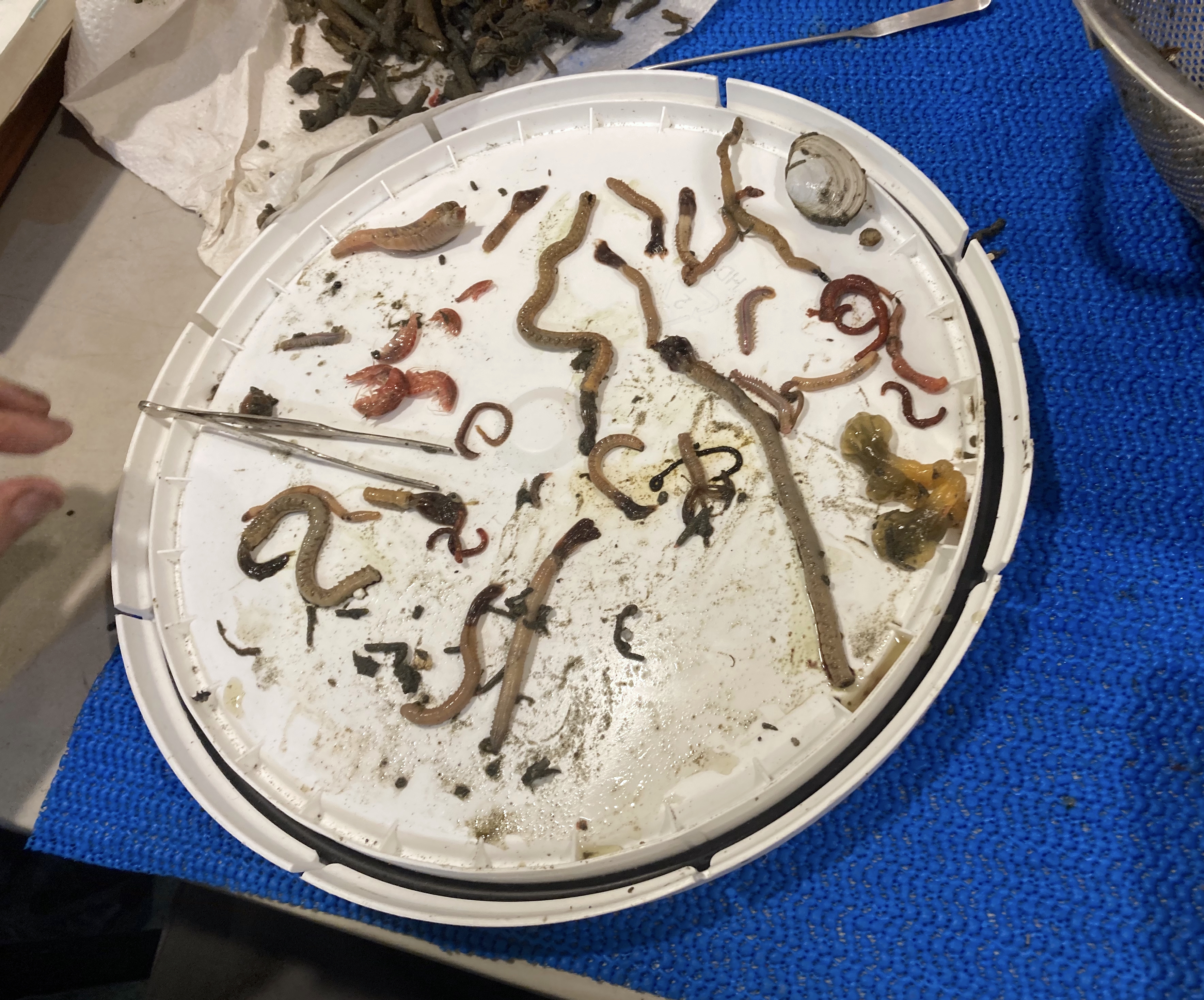 Maldanid worms, terebellid worms, and ampharetid worms found in a sediment grab are prepared for storage. Aboard the Norseman II in the Bering Strait.