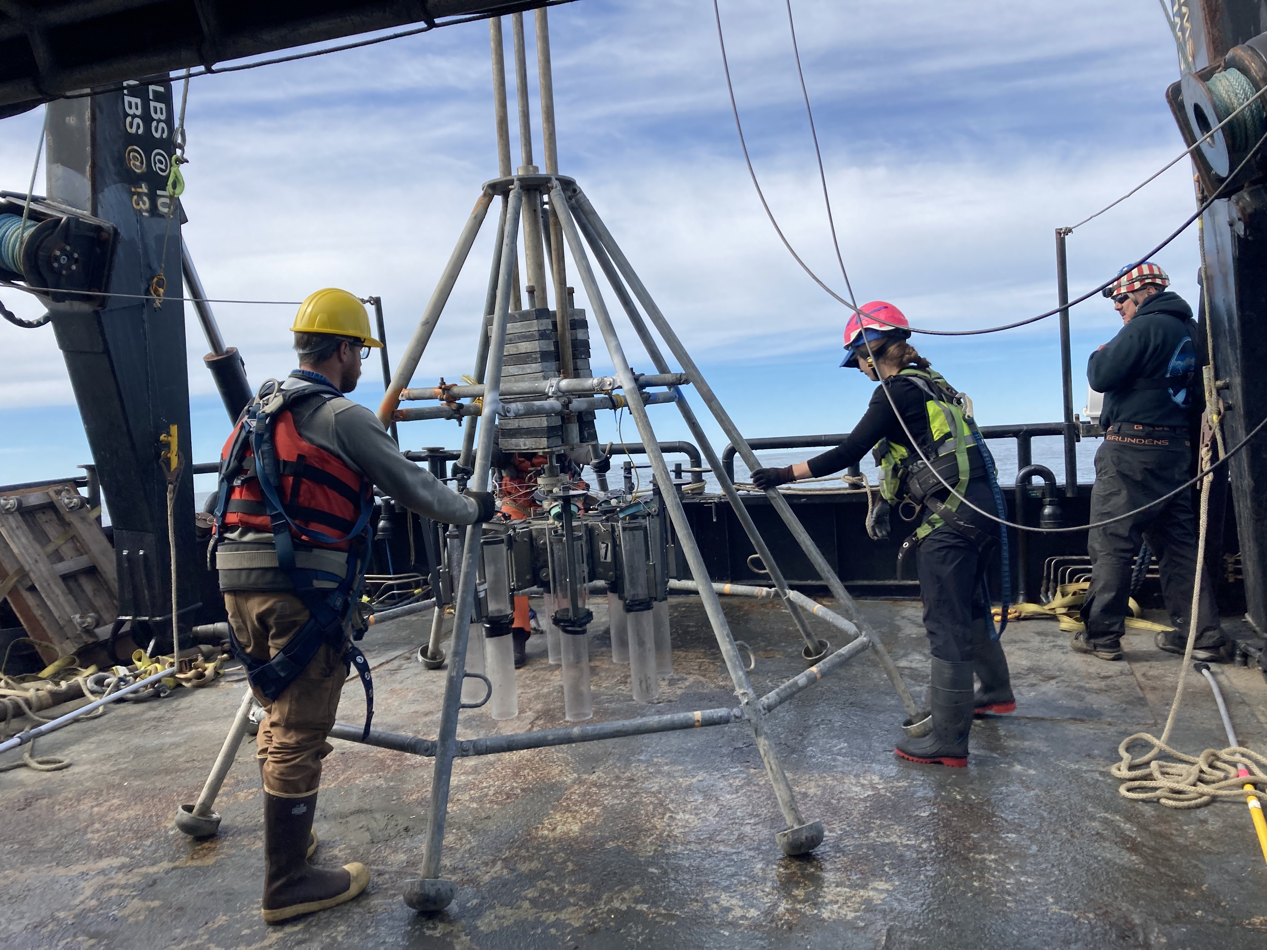 Ben Frieberg and Lyda Rees maneuver the multicore into position for deployment while Jim Wells stands by to operate the A-frame. Aboard the Norseman II in the southern Chukchi Sea.