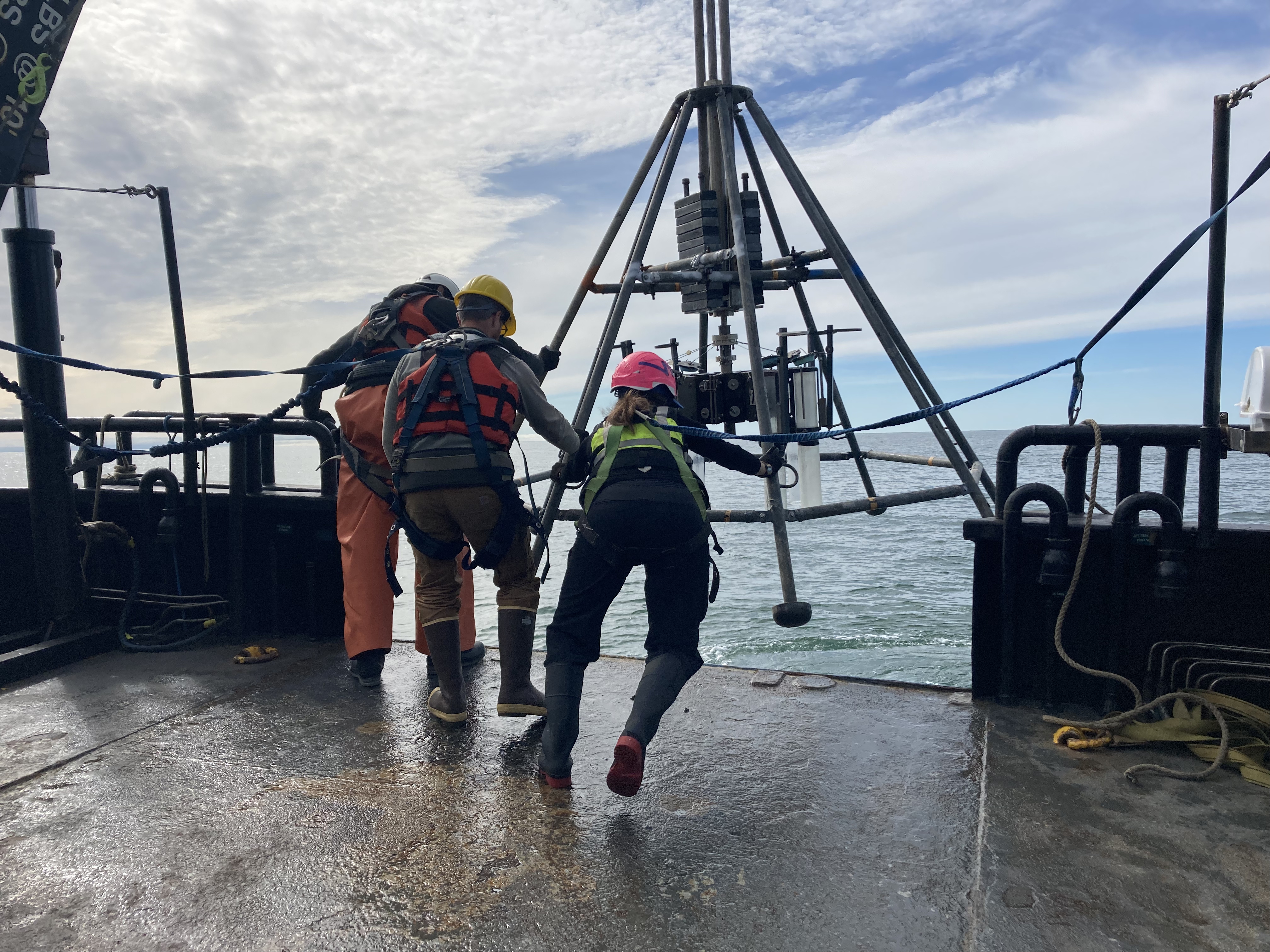 Ben Frieberg and Lyda Rees maneuver the multicore into position for deployment. Aboard the Norseman II in the southern Chukchi Sea.