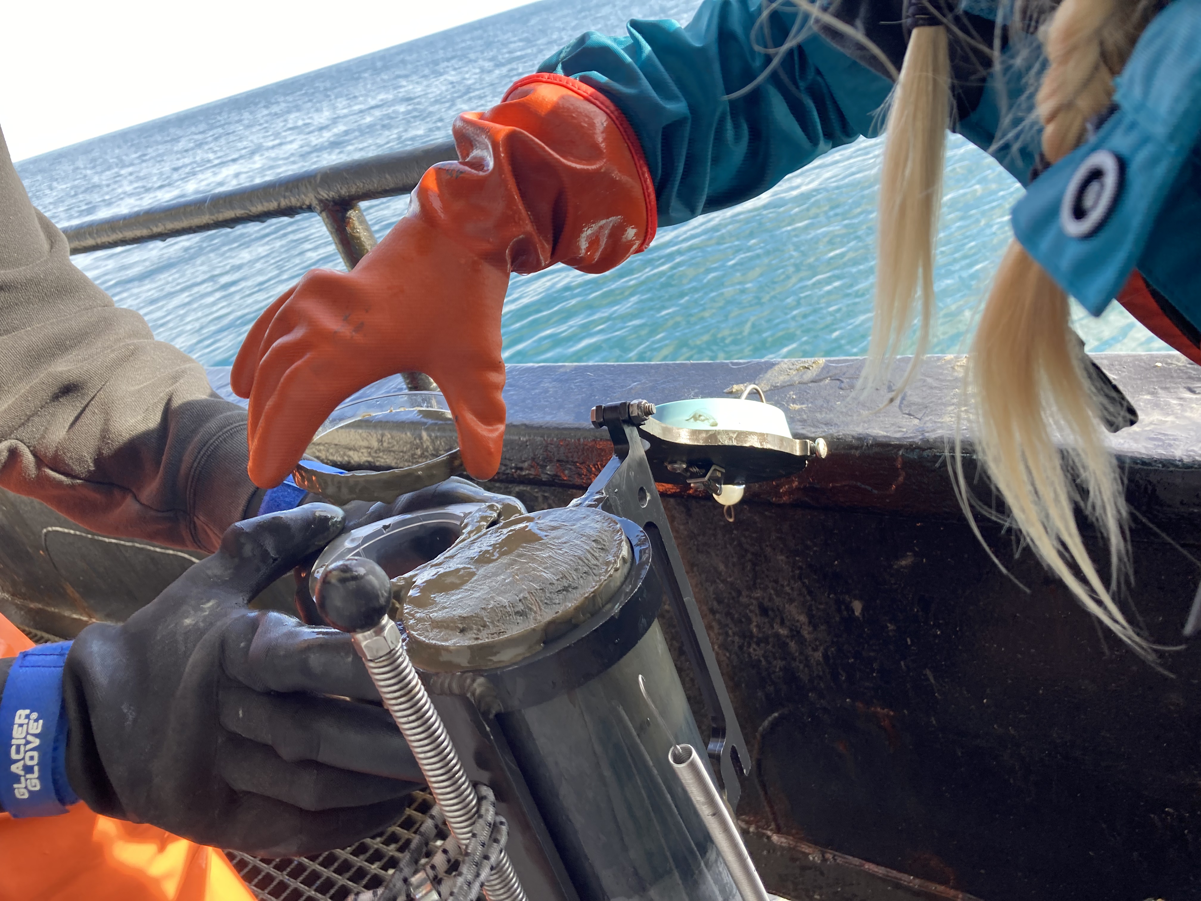The top centimeter of sediment in the multicore is collected for sampling. Aboard the Norseman II in the southern Chukchi Sea.