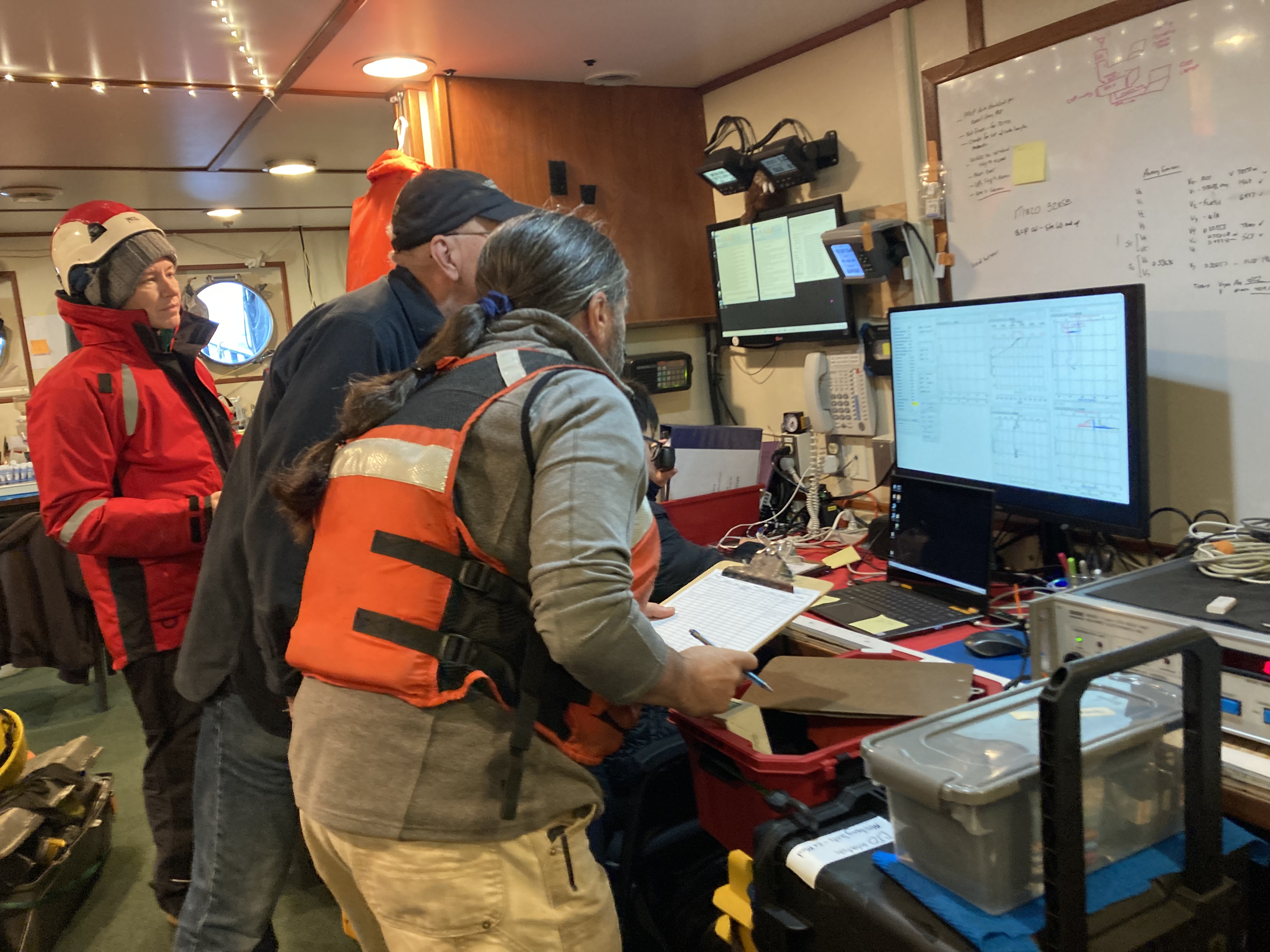 Kate Hubbard, Dean Stockwell, and Miguel Goni scrutinize the data from the CTD (Conductivity, Temperature, and Depth instrument) to determine from which depths to sample water. Aboard the Norseman II in the Chukchi Sea.
