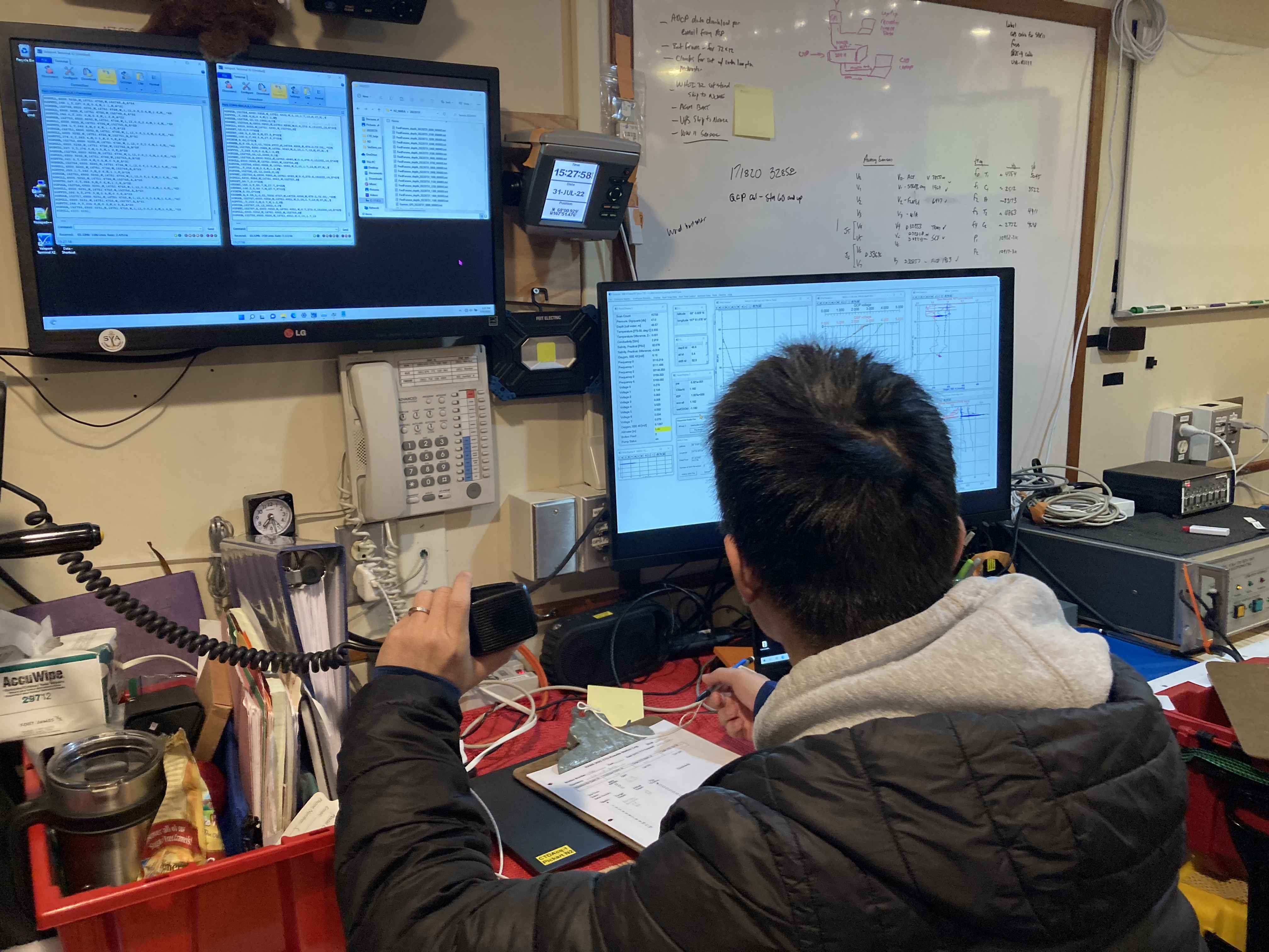 Jie Huang monitors the data from the CTD (Conductivity, Temperature, and Depth instrument) in order to fire the Niskin bottles at the correct heights and prevent the rosette from hitting the sea floor. Aboard the Norseman II in the Chukchi Sea.