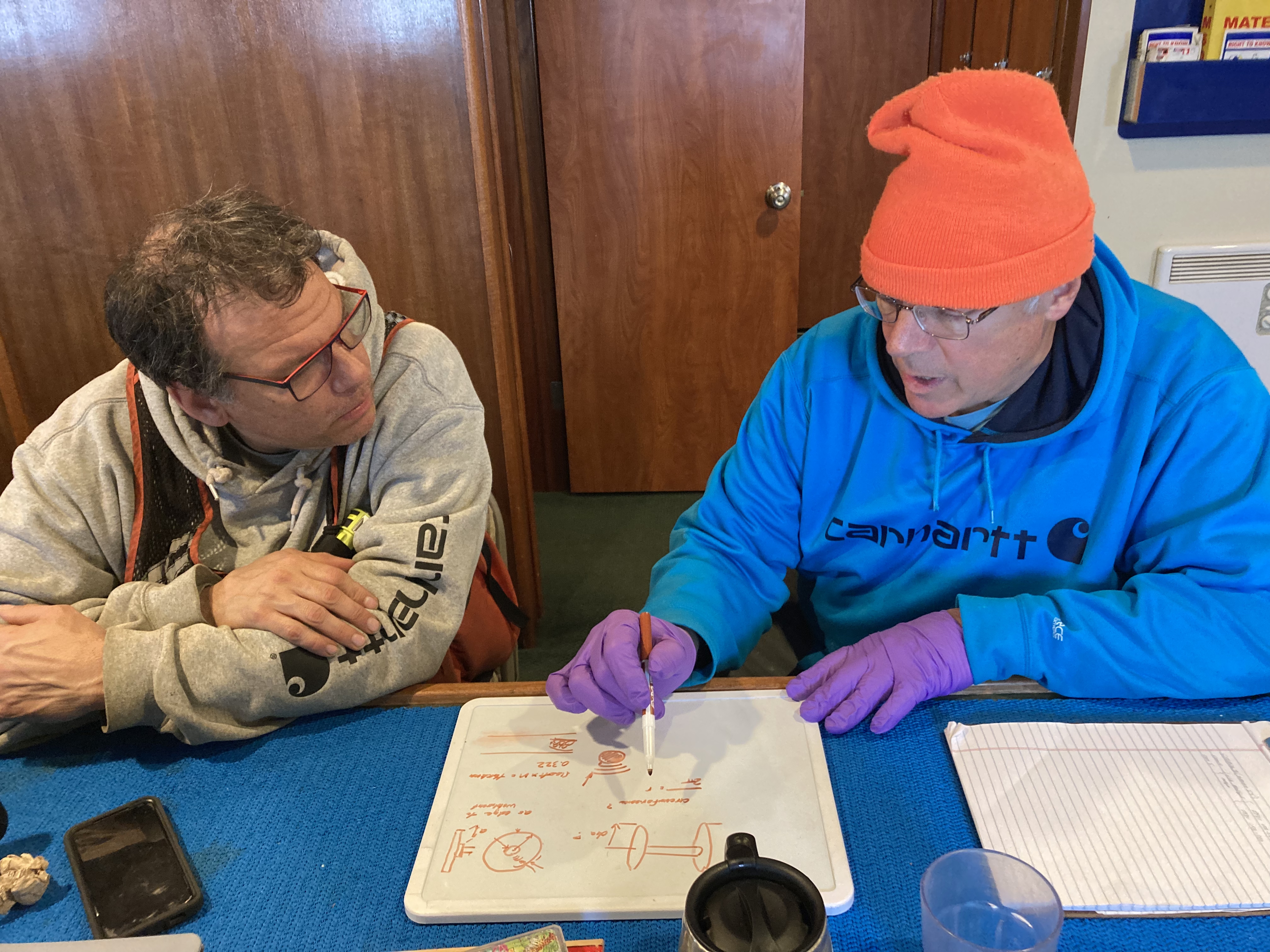 Marshall Swartz and James Longero calculate the conductivity of the wire connecting the CTD (Conductivity, Temperature, and Depth instrument) to its computer. Aboard the Norseman II in the Chukchi Sea.