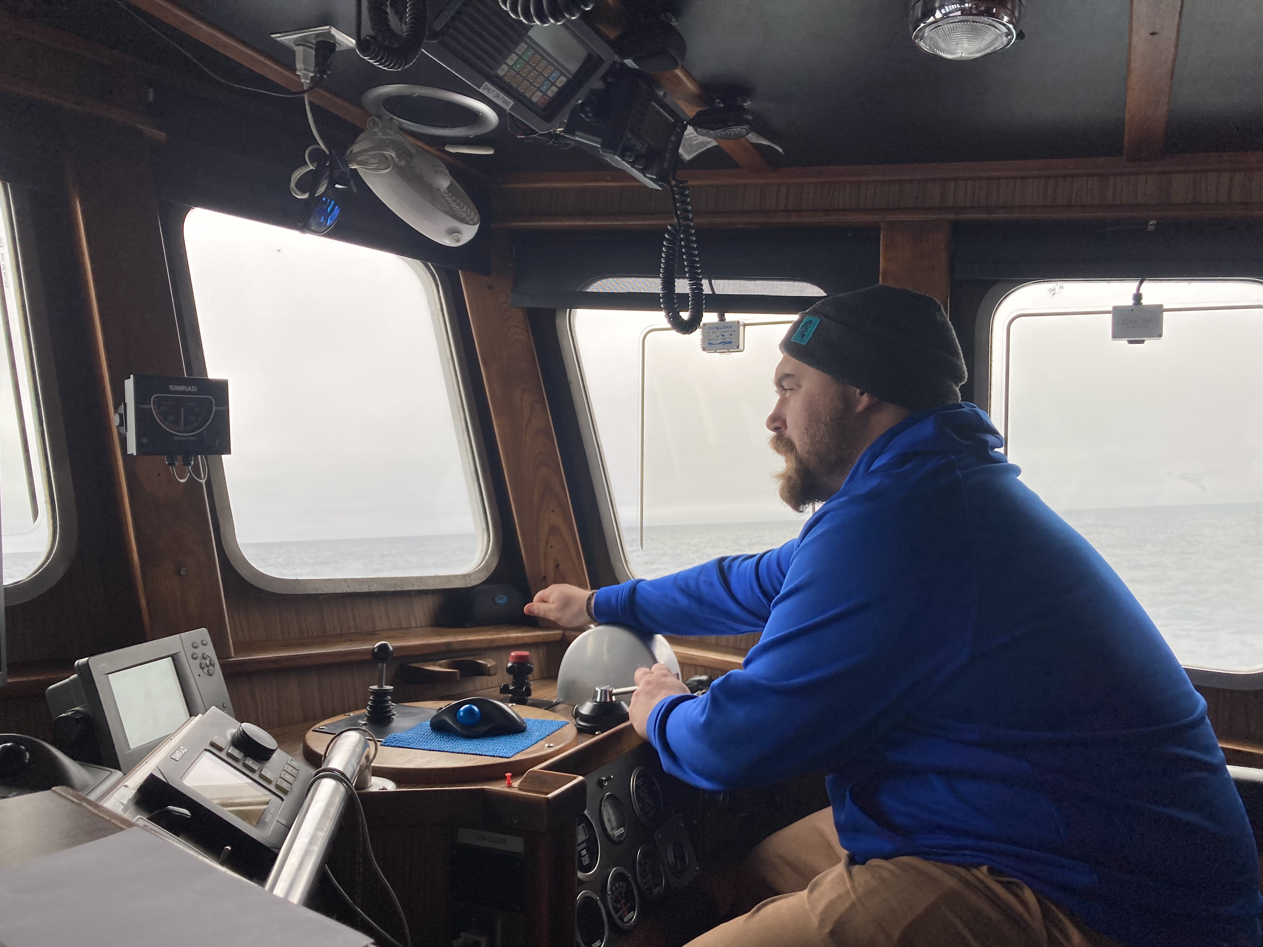 Captain Casey Coates tracks back and forth across a station, waiting for the seas to calm down enough to deploy equipment. Aboard the Norseman II in the Chukchi Sea.