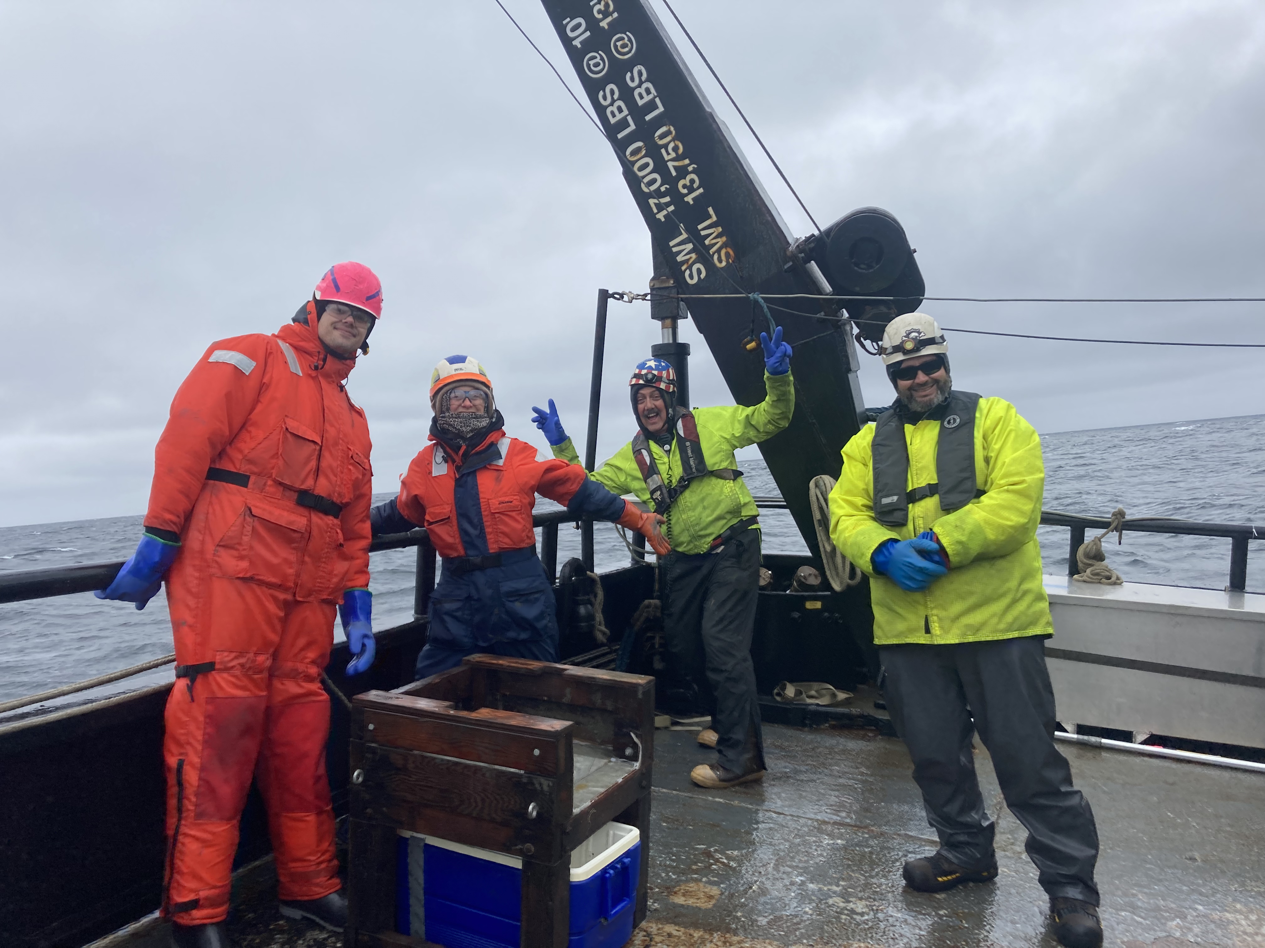 Nate Spada, Kali Horn, Jim Wells, and Kit Keppler wait for the Smith-McIntyre grab to return to the surface. Aboard the Norseman II in the Chukchi Sea.