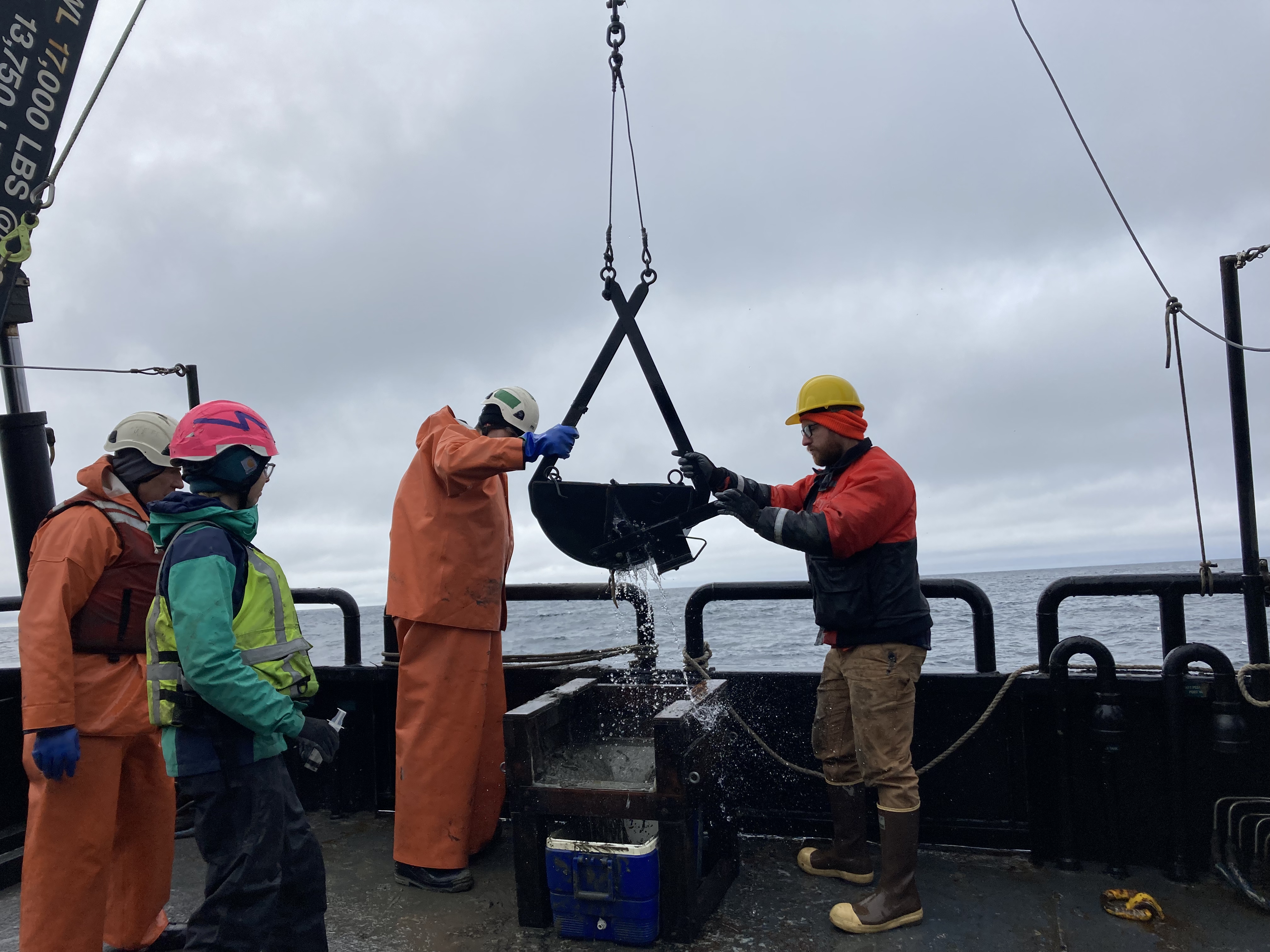 Dave Kulis, Evie Fachon, Nate Spada, and Ben Frieberg retreive the Van Veen grab. Aboard the Norseman II in the Chukchi Sea.