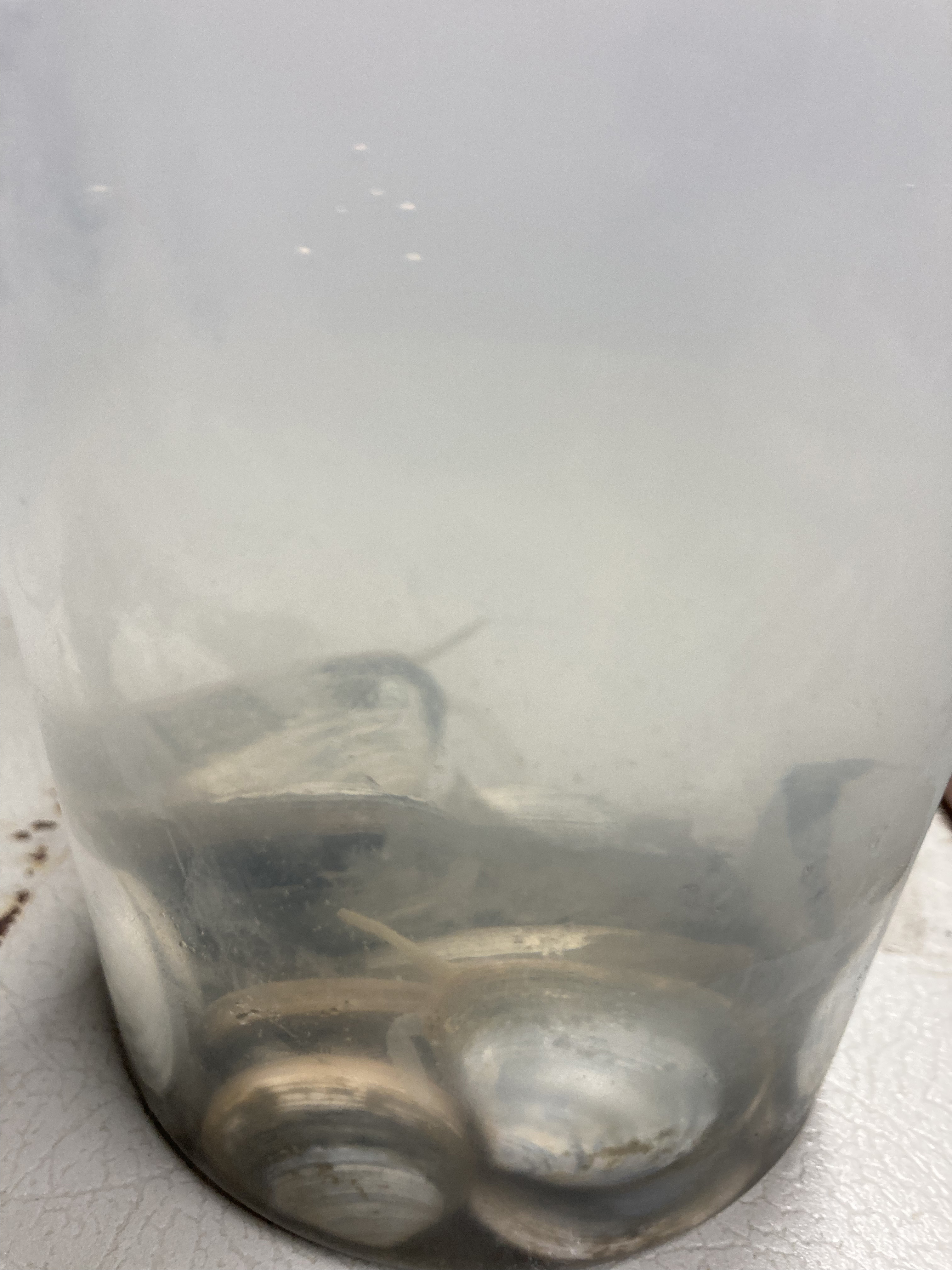 Macoma calcarea clams are stored in plastic containers in the van for a toxin depuration experiment. Aboard the Norseman II in the Bering Strait.