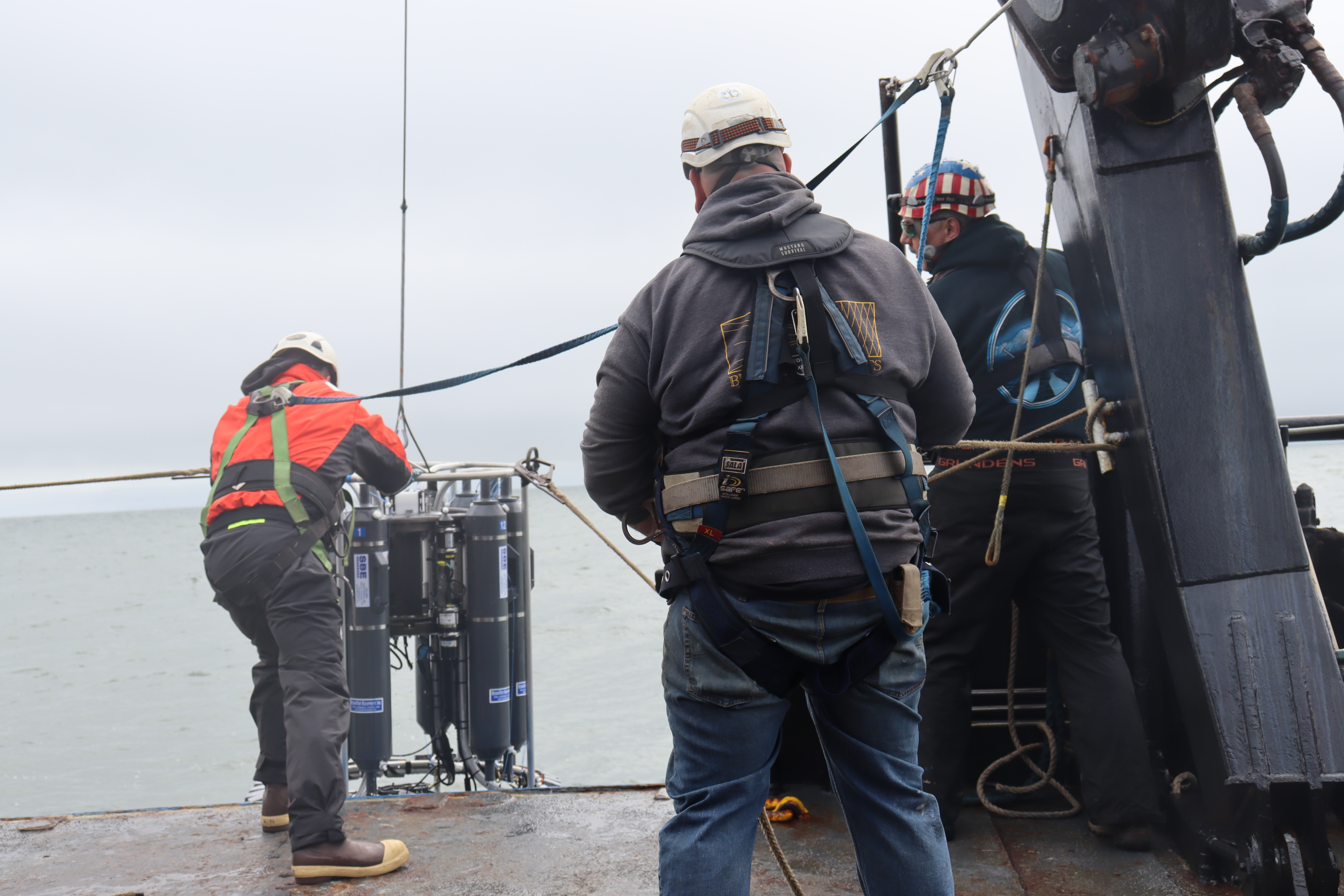 Kerry Norton retrieves the CTD (Conductivity, Temperature, and Depth instrument) while Jim Wells operates the winch and Kit Keppler grips a tag line. Aboard the Norseman II in Norton Sound.