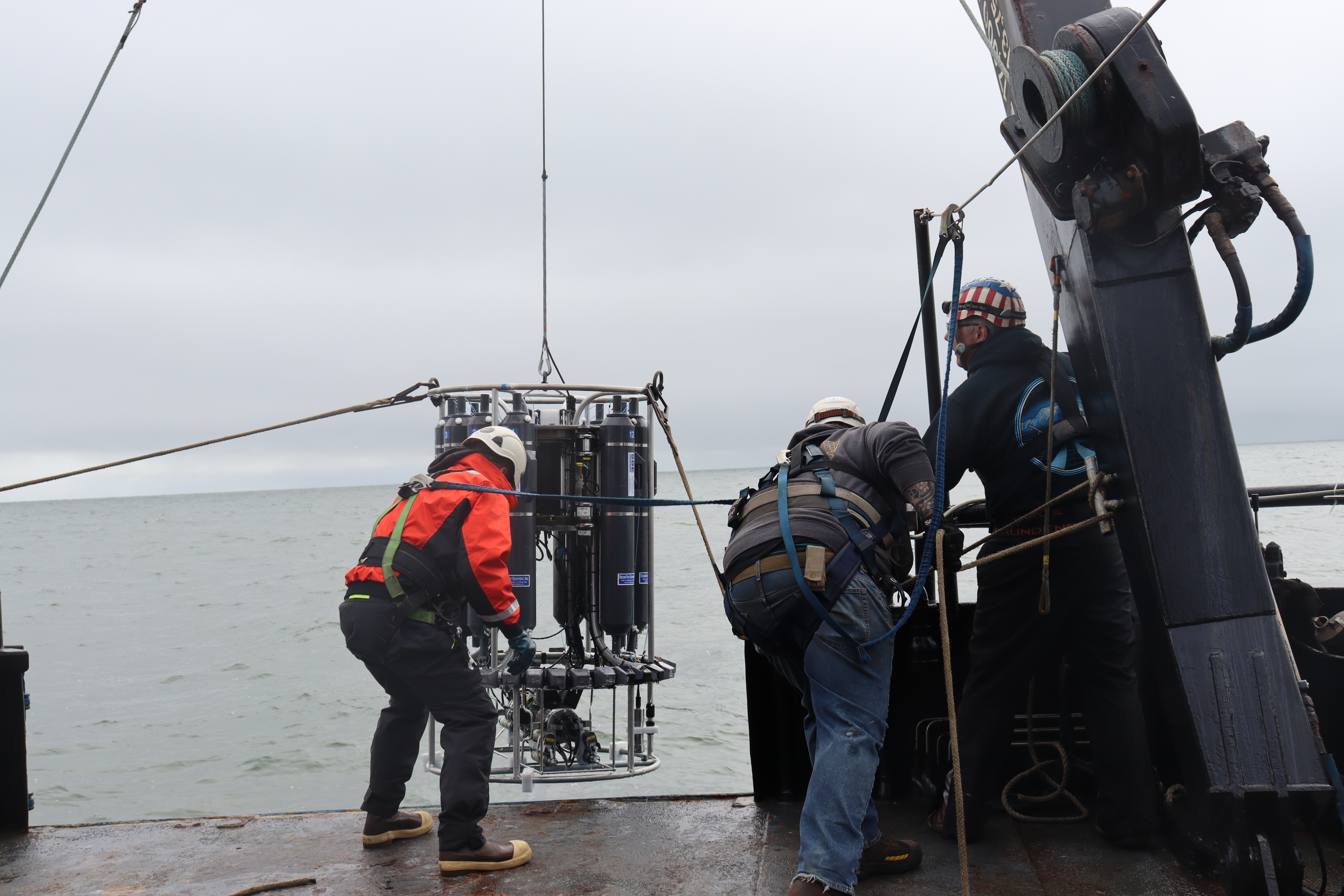 Kerry Norton and Kit Keppler retrieve the CTD (Conductivity, Temperature, and Depth instrument) while Jim Wells operates the winch. Aboard the Norseman II in Norton Sound.