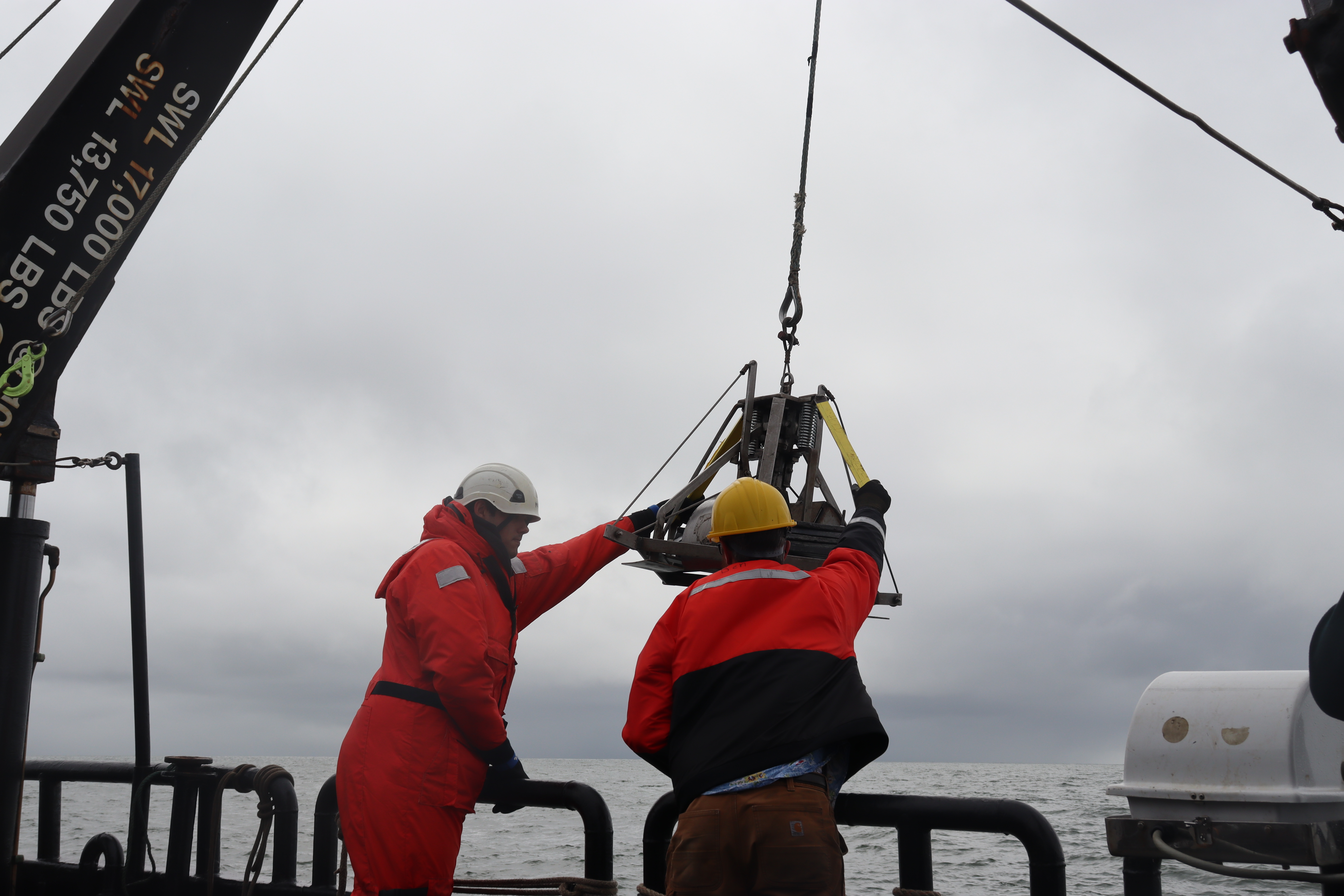 Nate Spada and Ben Frieberg deploy the Smith-McIntyre grab. Aboard the Norseman II in Norton Sound.