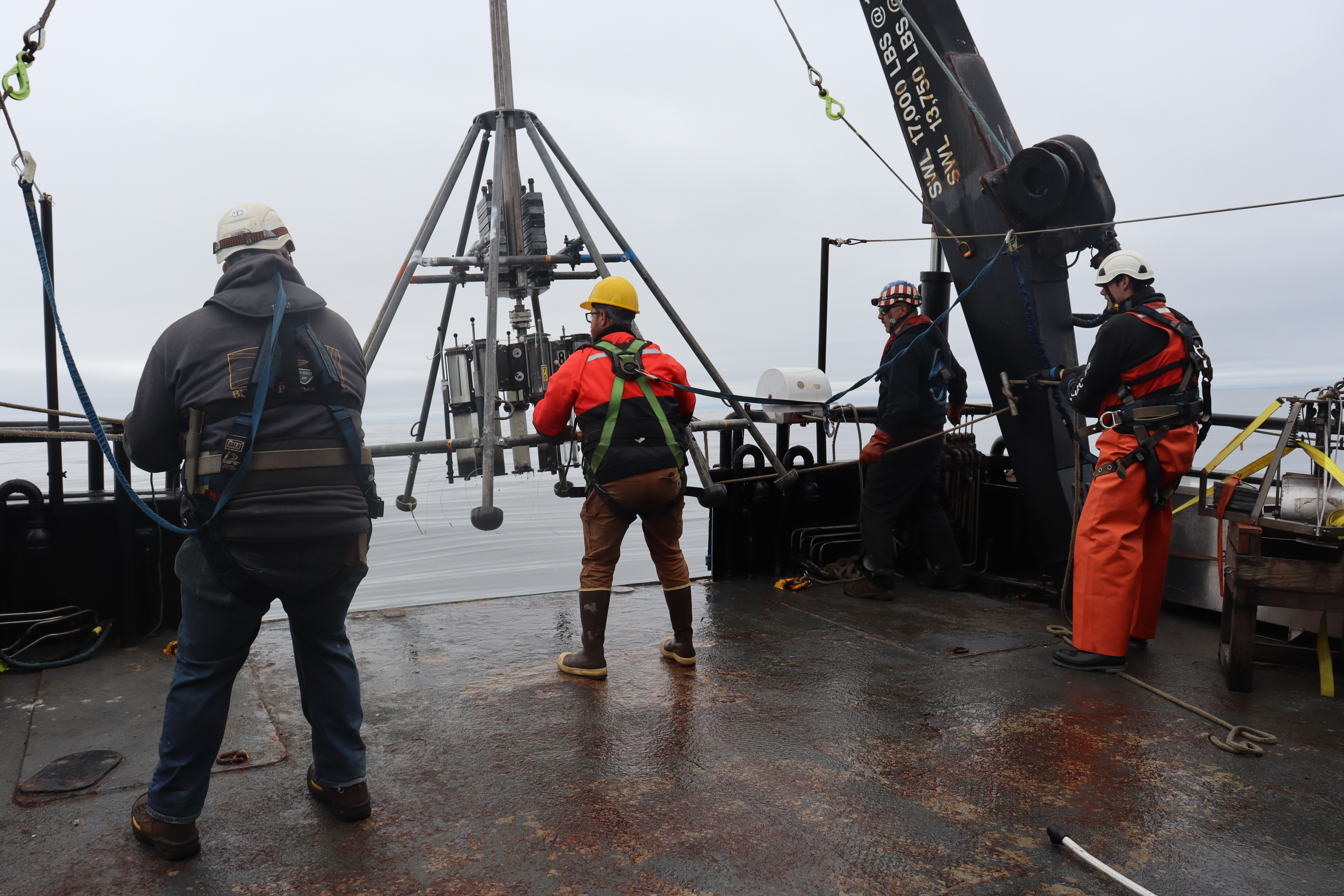 Kit Keppler, Ben Frieberg, Jim Wells, and Nate Spada recover the multicore. Aboard the Norseman II in Norton Sound.