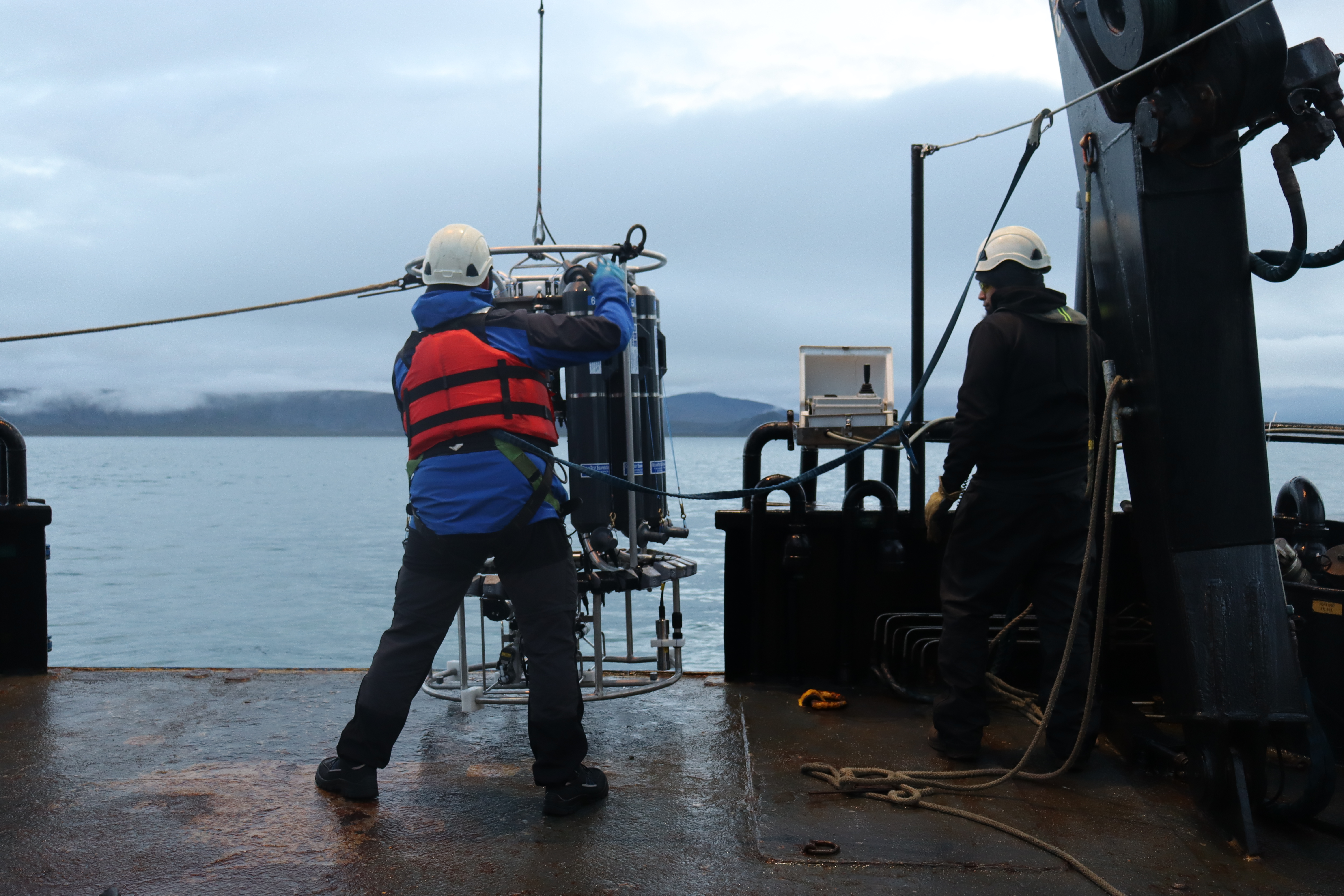 Joan Pou recovers the CTD (Conductivity, Temperature, and Depth instrument) while Mike Rathibhan operates the winch. Aboard the Norseman II in the Bering Sea near Saint Lawrence Island, Alaska.