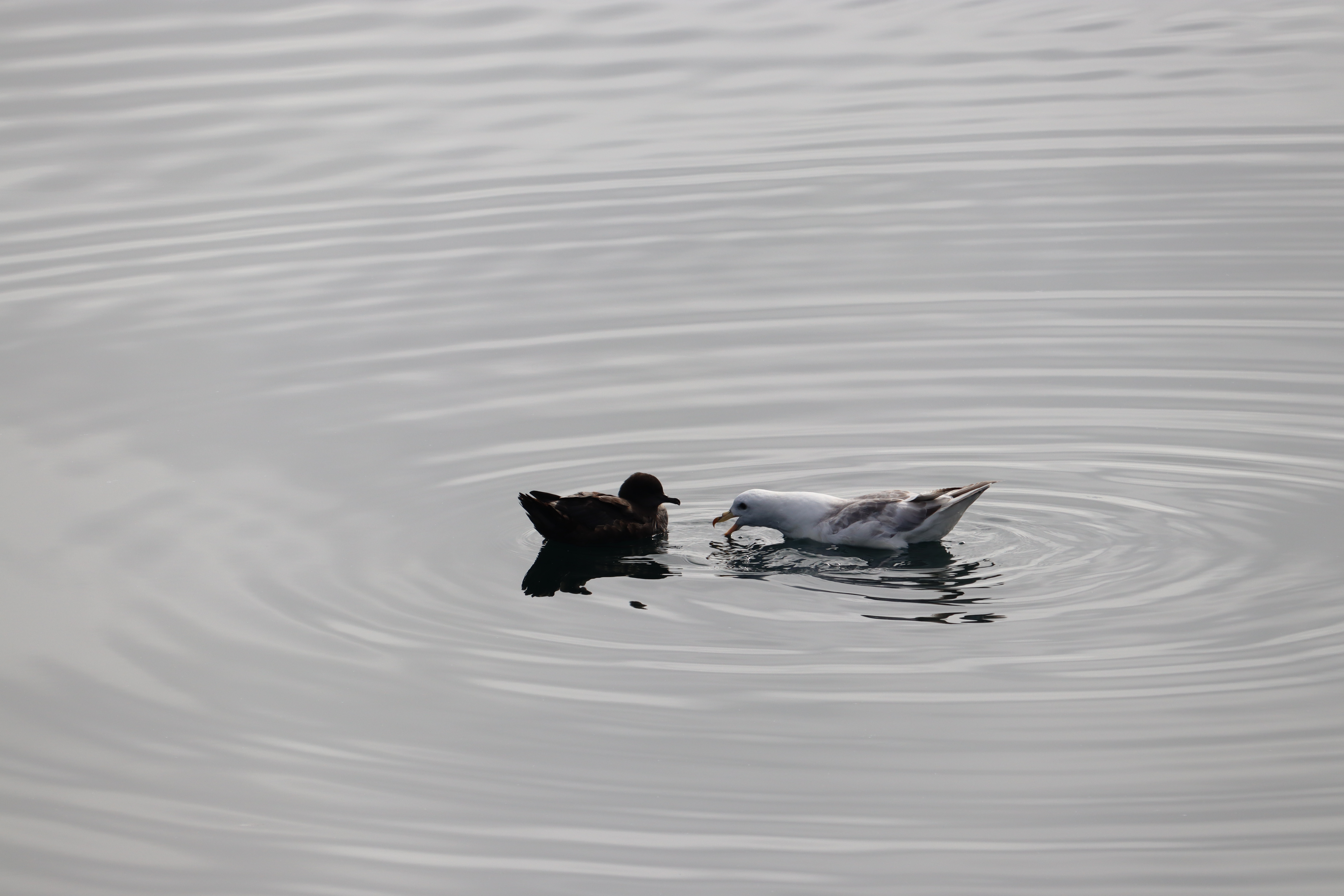 A northern fulmar interacts with a short-tailed shearwater. Aboard the Norseman II in the Chukchi Sea.