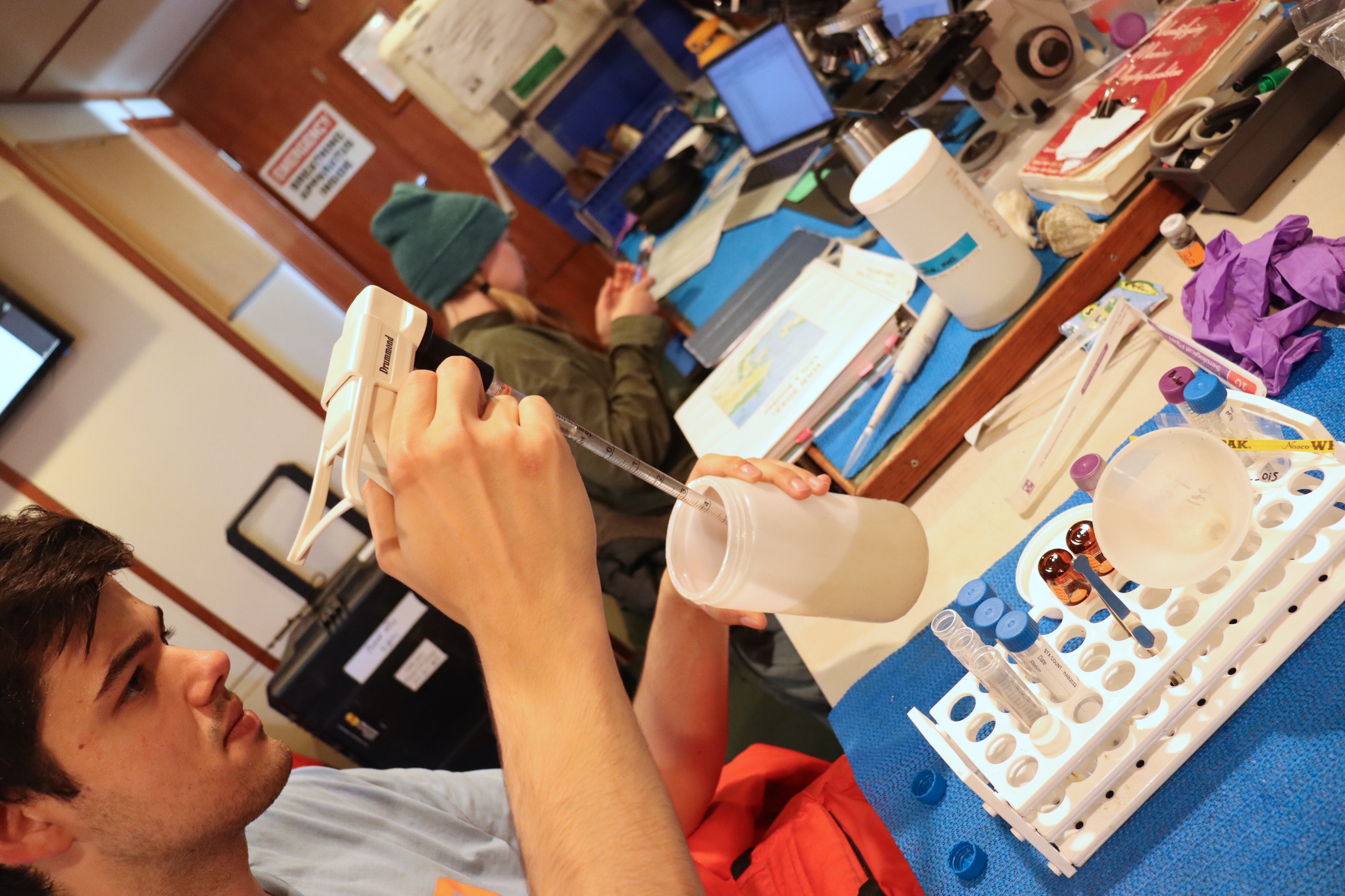 Nate Spada processes plankton samples. In the background, Evie Fachon works on the IFCB (Imaging Flow CytoBot). Aboard the Norseman II in the Chukchi Sea.