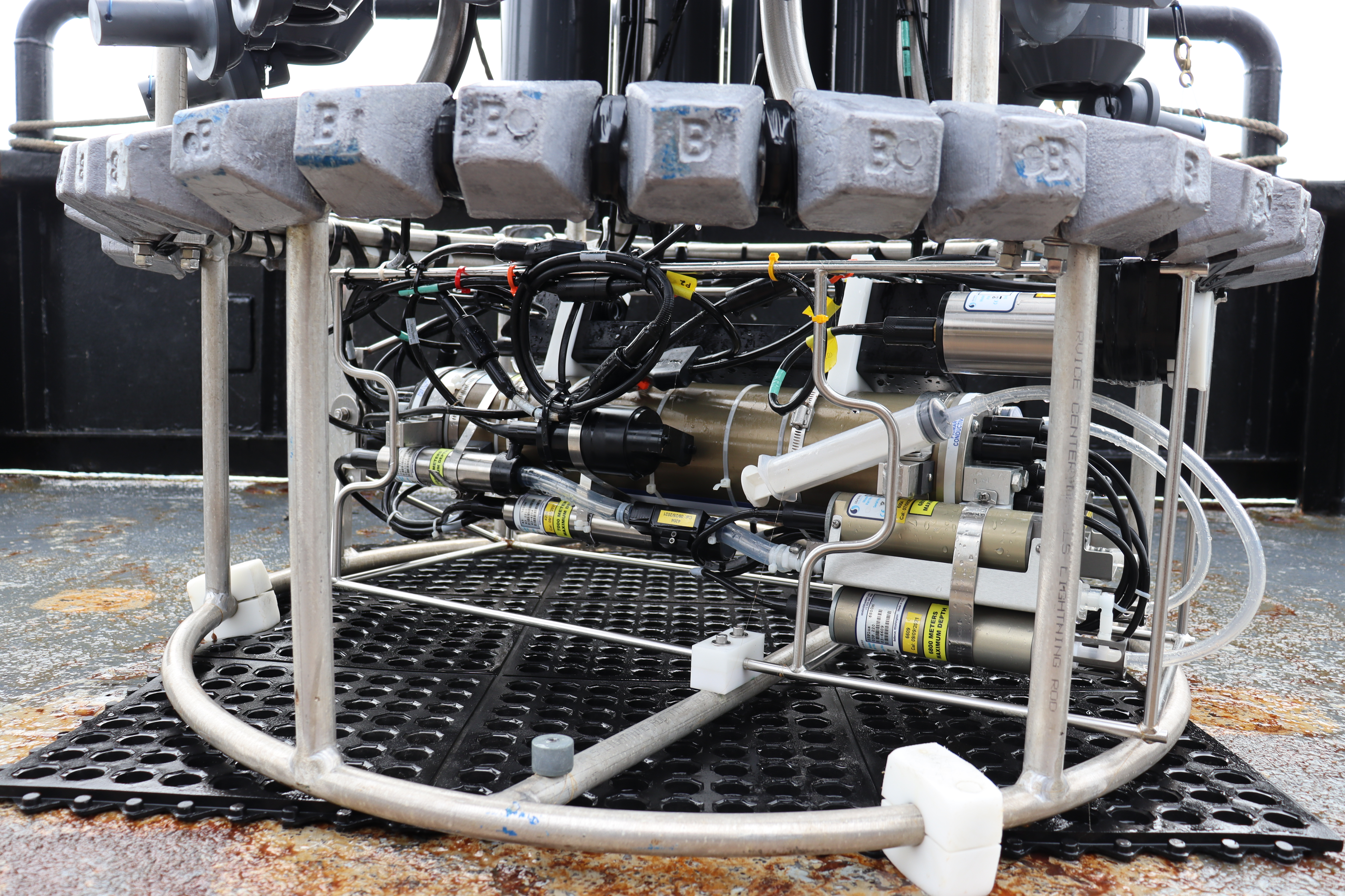 The CTD (Conductivity, Temperature, and Depth instrument) is attached to the bottom of a frame called a rosette. Aboard the Norseman II in Ledyard Bay, Chukchi Sea.