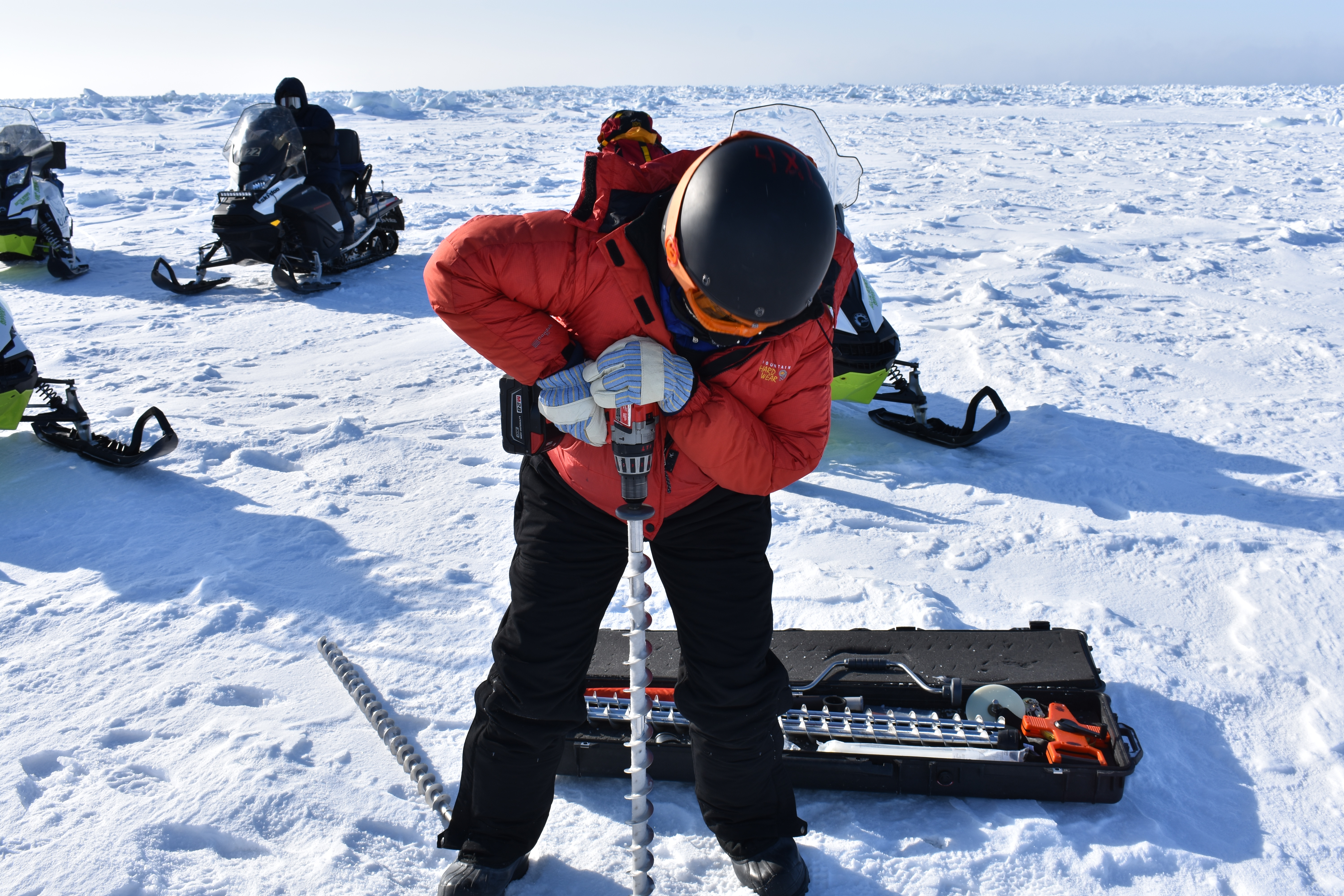 Sarah R. Johnson drills a 2-inch hole approximately 130cm down into the sea ice before installing a current meter just below the sea ice in the Arctic Ocean. Approximately 0.5 miles offshore of Utqiagvik, Alaska on the sea ice.