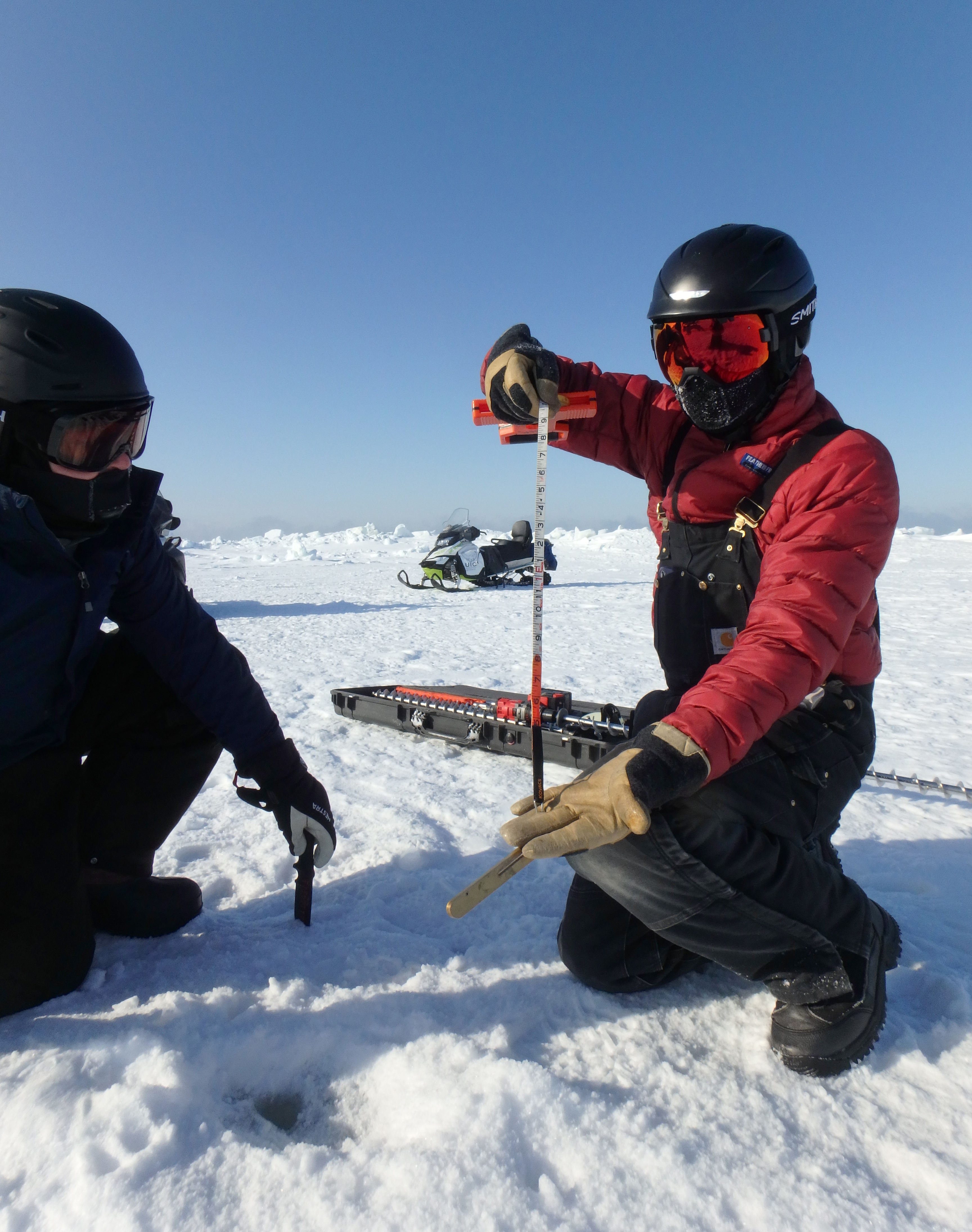 Ben Cohen (left) and Ignatius Rigor (right) use an ice thickness gage to measure ice at the holes used to deploy tilt meters. Approximately 0.5 miles offshore of Utqiagvik, Alaska on the sea ice.