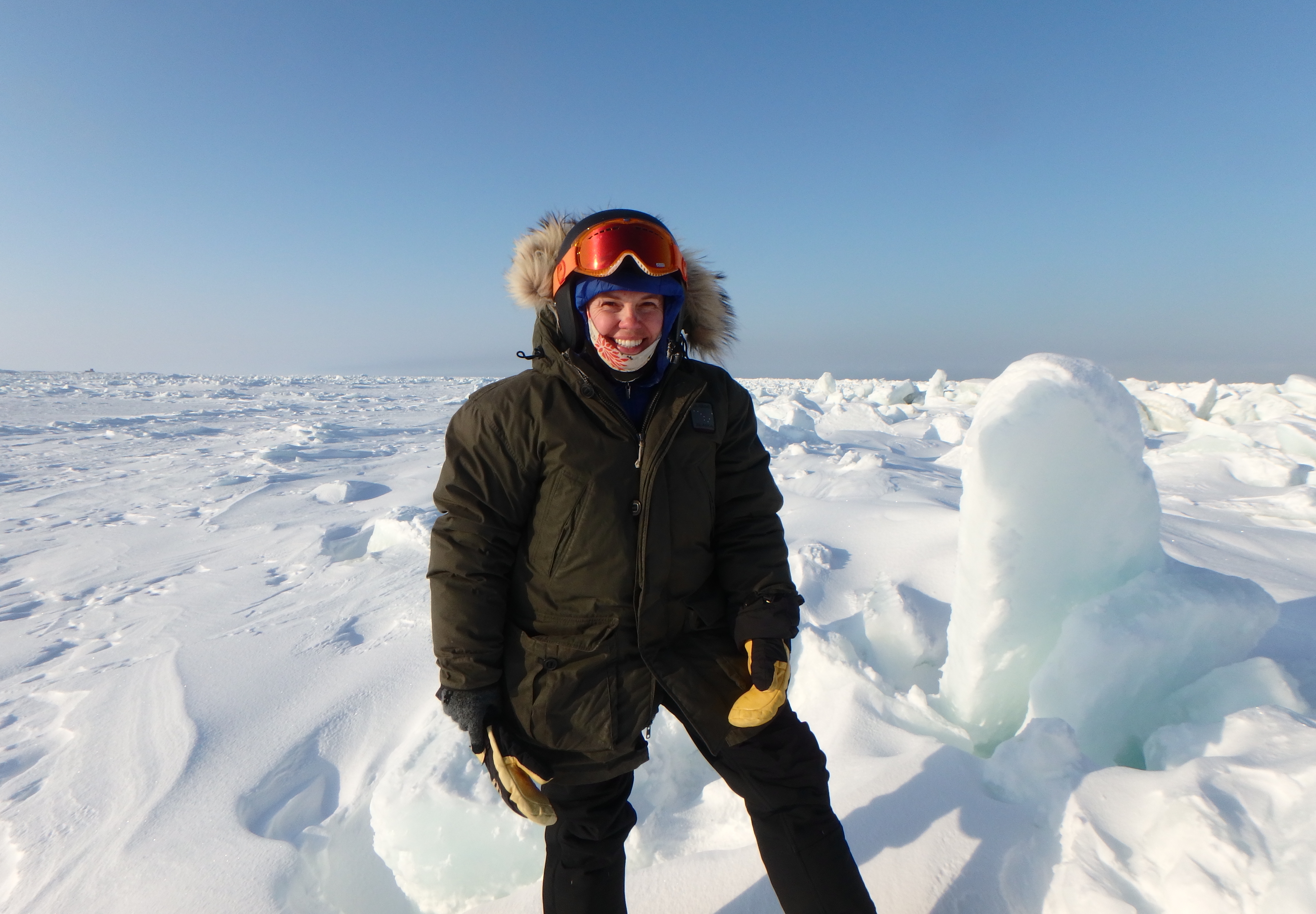Sarah R. Johnson poses on the Arctic sea ice, approximately 0.5 miles offshore of Utqiagvik, Alaska on the Arctic sea ice.