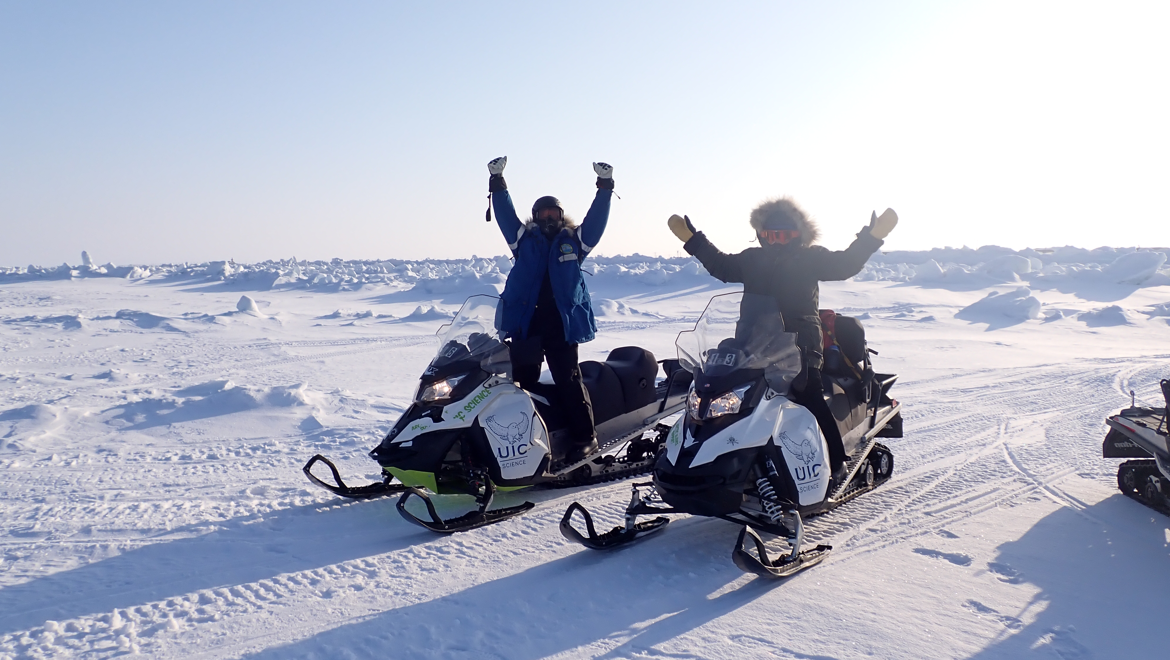 Ben Cohen (left) and Sarah R. Johnson (right) on UIC Science snowmobiles on the sea ice in route to a field site offshore of Utqiagvik, Alaska.