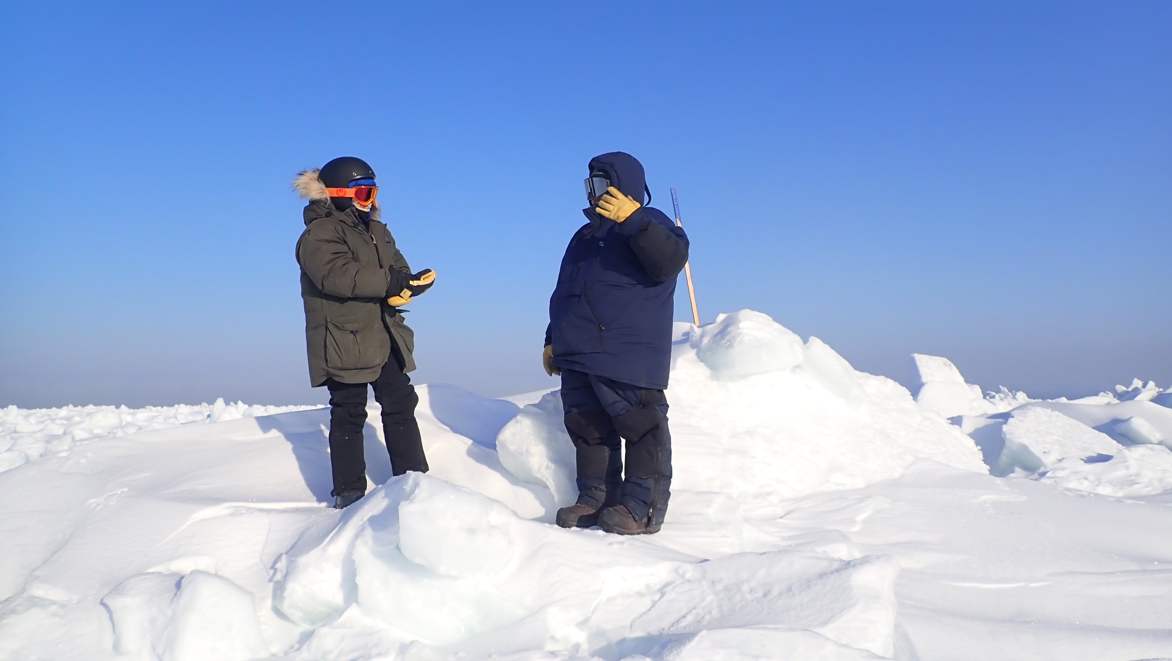 Sarah R. Johnson (left) discusses sea ice conditions with UIC Science Field Tech (and bear guard) Qaiyaan Wilbur Leavitt. They stand along a whaling trail used by a local whaling team during spring bowhead whale subsistence hunting. Approximately 0.5 miles offshore of Utqiagvik, Alaska.