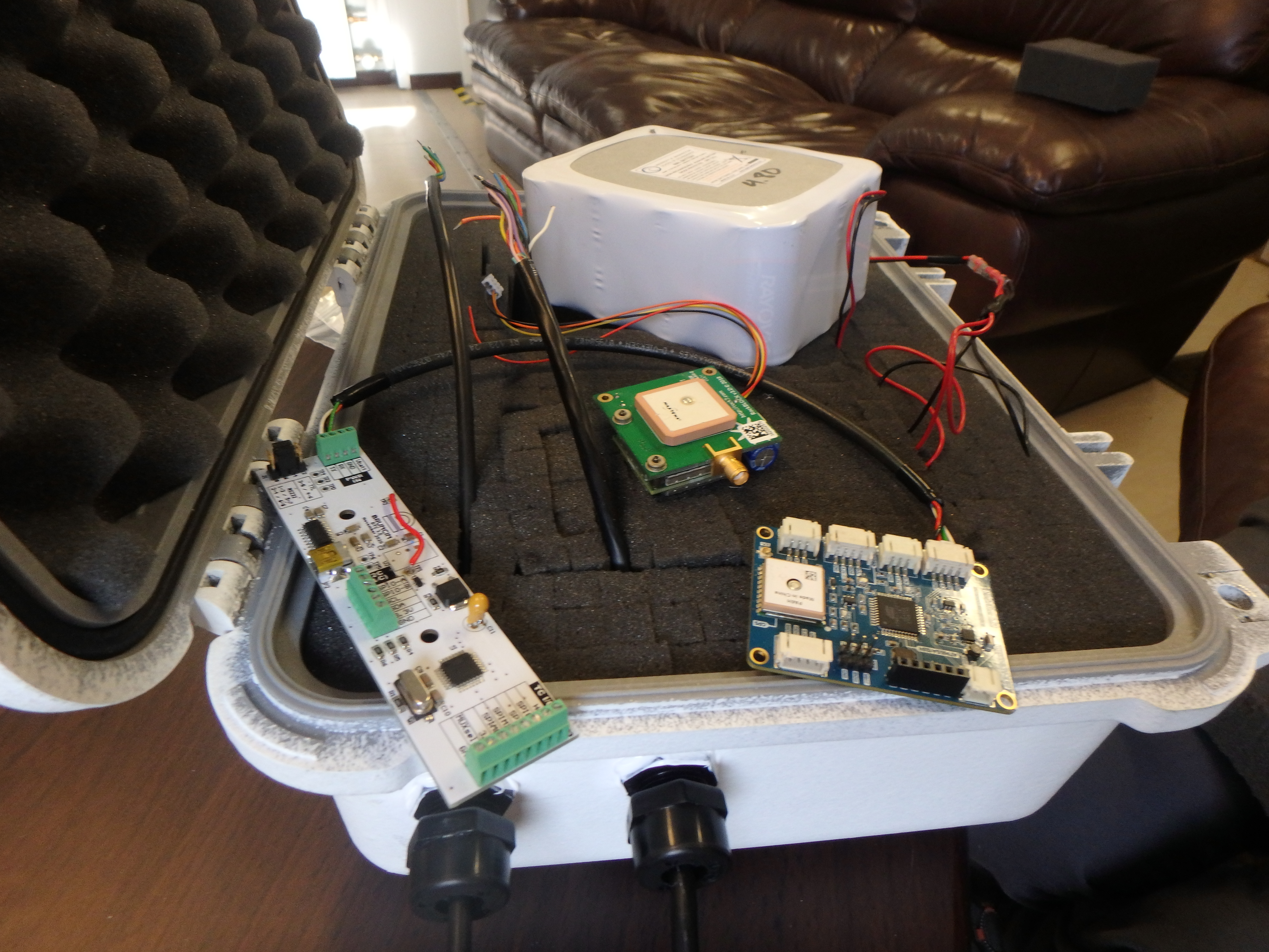 The electronics, batteries, satellite modem, and observing sensors inside an Arctic buoy that work together to measure air pressure, temperature, time, and location. Naval Arctic Research Laboratory, Utqiagvik, Alaska.