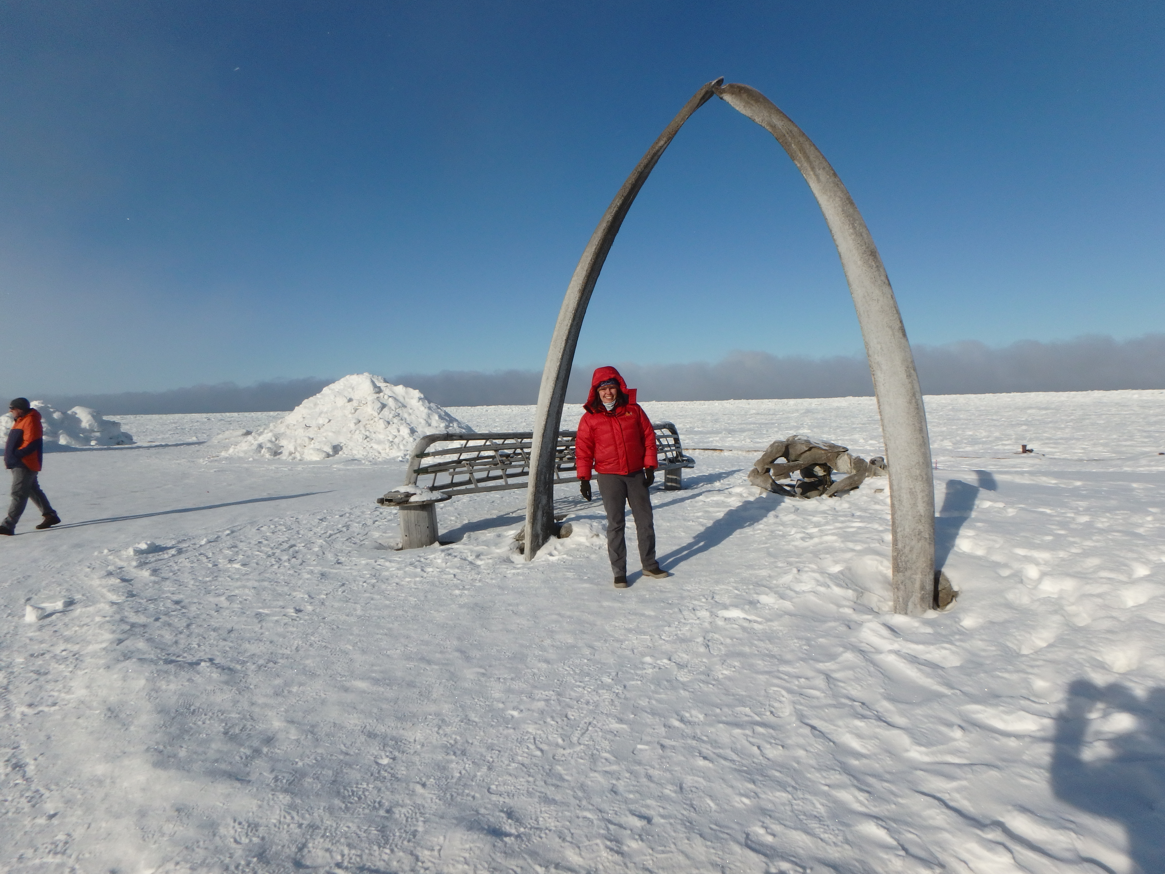 Sarah R. Johnson at Whale Bone Arch in Utqiagvik, Alaska on the coast of Arctic Ocean with steam fog in the background. Steam fog is present when there is an open lead on the Arctic Ocean as the water is significantly warmer than the air temperature. Utqiagvik, Alaska.