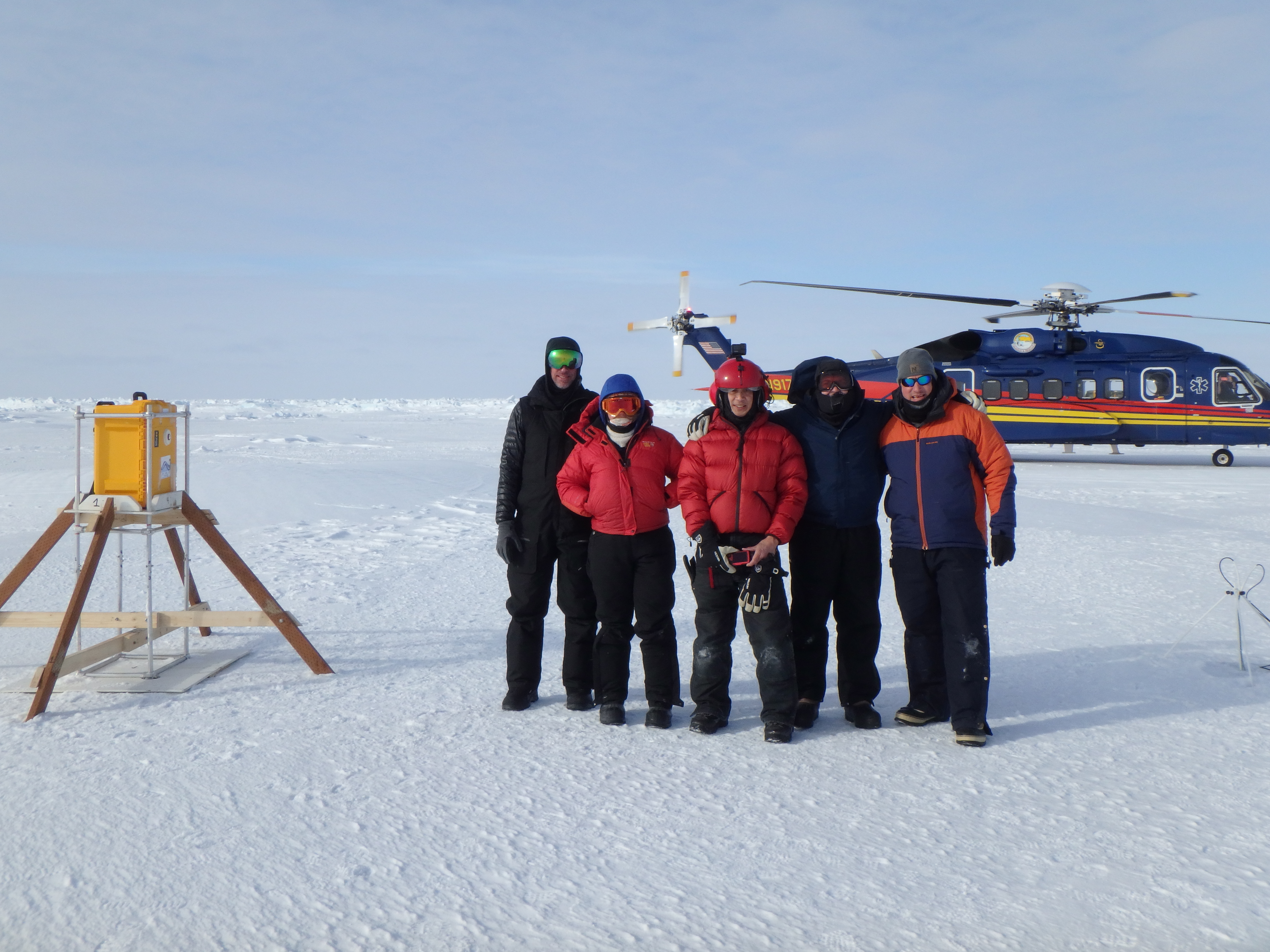 The International Arctic Buoy Programe 2022 Spring Deployment Team poses at the deployment cluster site after completing the installation of the buoys. Left to right: Cy Keener, Sarah R. Johnson, Ignaitus Rigor, Ben Cohen, and John Woods. 100 miles north northeast of Utqiagvik, Alaska on the Arctic Ocean.