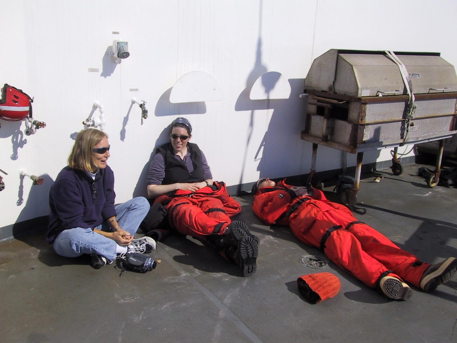 Photo By Steve Roberts - Sarah Story and Heike Merkel with Susan Schonberg(left)while waiting to go out onto the ice. arctic ocean healy hly0402 SBI chukchi beaufort sea ice breaker.