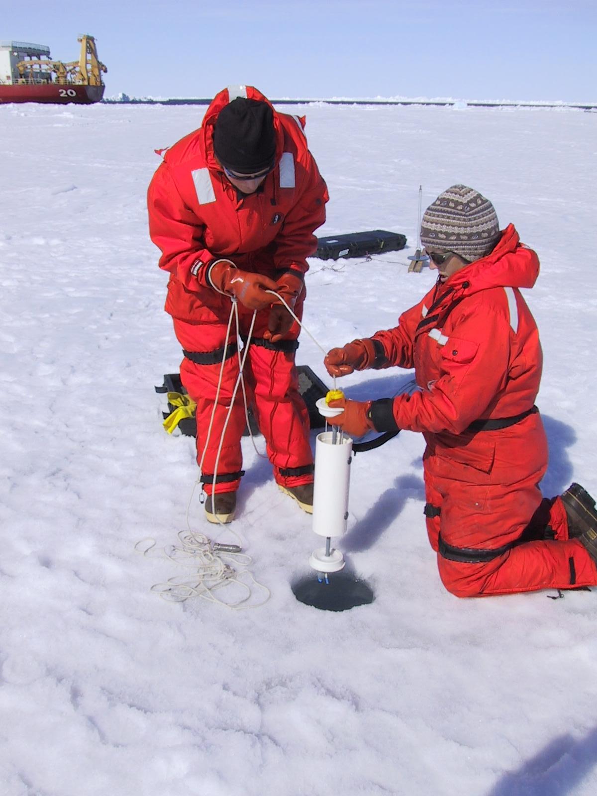 Heike Merkel and Sarah Story collecting water samples from under the ice. Chukchi/Beaufort Seas 71 41.5 N 154 49.4 W.