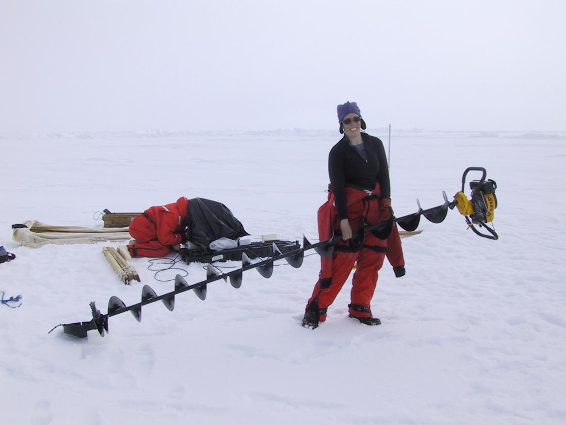 Sarah Story holding the ice drill that we used to cut a hole through the ice. Taken at Chukchi/Beaufort Seas 72 51.3 N 158 13.1 W.
