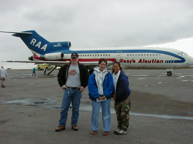 Students Dan Brower and Rita Frantz from Barrow and Anuhea Kamakele from Waianae Hawaii pose in front of their ride home from banding Steller's Eiders in Izembek NWR, Alaska.