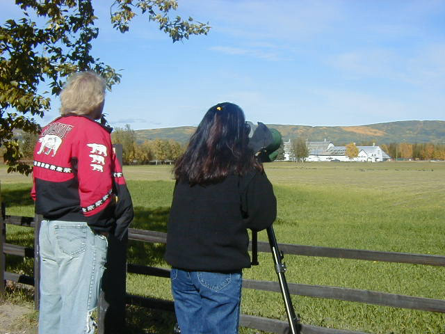 Tim Obritschkewitsch and Anuhea Kamakele observe Canada geese migrating through Fairbans and try to identify birds wearing neck collars with an individual code at Creamers Field refuge.