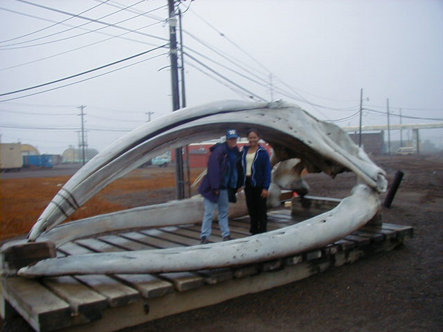 Michele Hauschulz and Anuhea Kamakele pose in the skull of a bowhead whale that is on display outside the North Slope Borough Department of Wildlife Management in Barrow, Alaska during a return visit to Barrow to share their experiences with Steller's Eiders