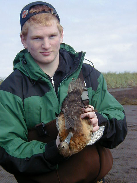 Dan Brower, a astudent from Barrow High school shows a Steller's Eider during the bird banding operation at Izembek National Wildlife Refuge.