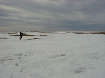 Philip Martin trudges across the snow in his hip waders to patches of tundra habitat where Steller's Eiders may be beginning to nest.