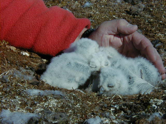 Denver Holt works with snowy owl chicks in a nest near Barrow.