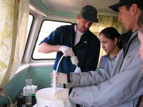 TREC researcher Max Holmes and students collect water samples.
