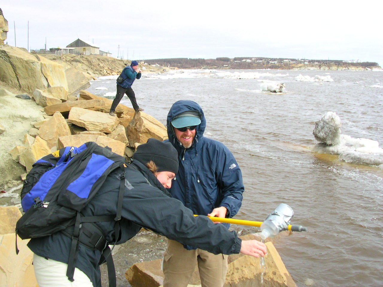 TREC teacher Amy Clapp and TREC researcher Max Holmes collect water samples from the Lena River, Siberia.