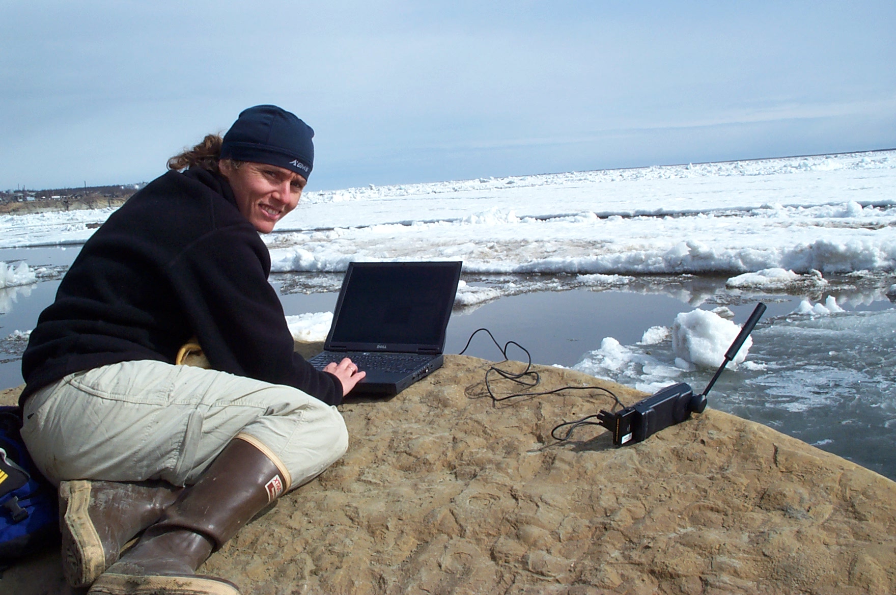 TREC teacher Amy Clapp uses the satphone and her laptop to stay connected and enter data near the Lena River, Siberia.