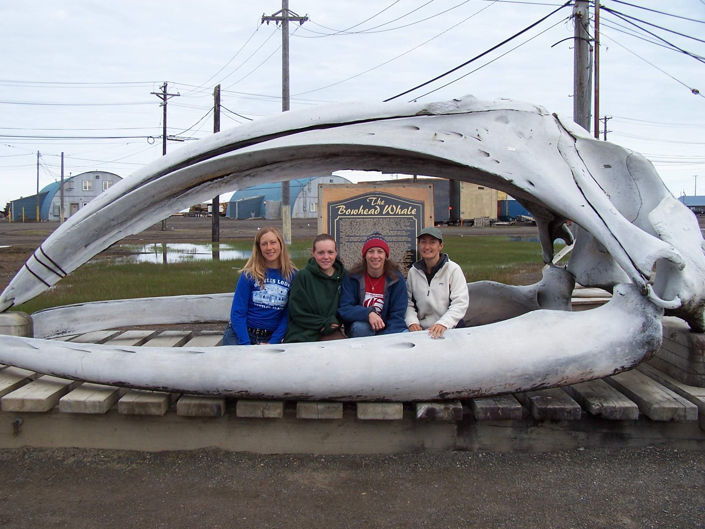 (L-R) Kirstin Skadberg, Jenny Richards, TREC teacher Misty Nikula-Ohlsen, and Kim Davis inside a bowhead whale skull in Barrow, Alaska.