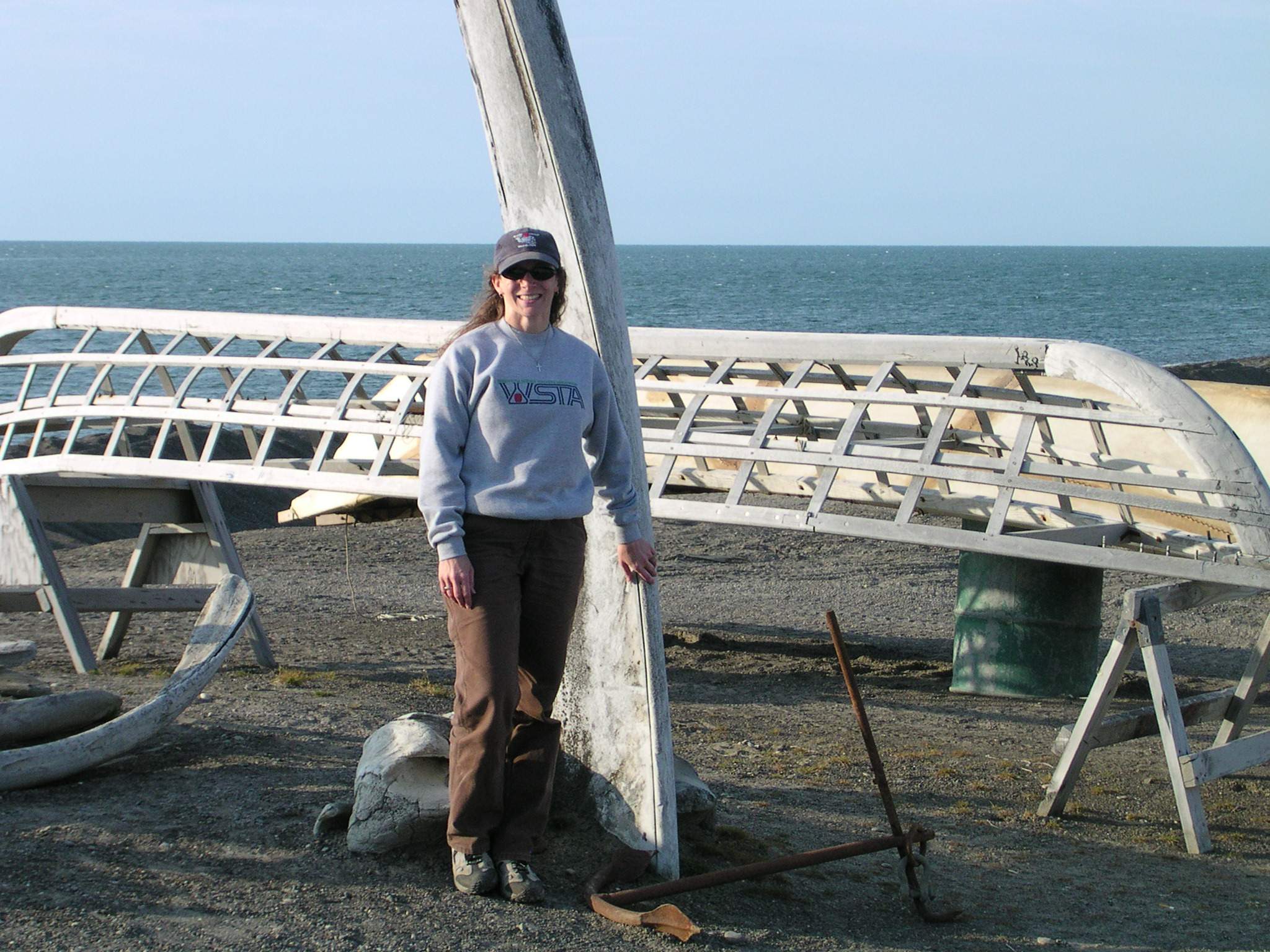 TREC teacher Misty Nikula-Ohlsen and whale bones on the beach near Point Barrow, Alaska.