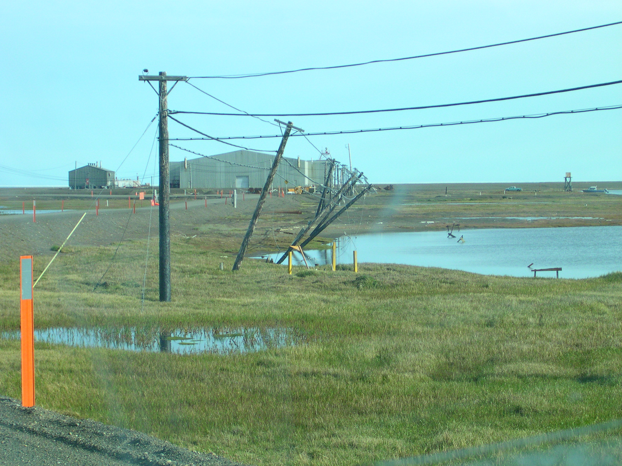 Tilted utility poles caused by melting ground, seen near Barrow, Alaska.