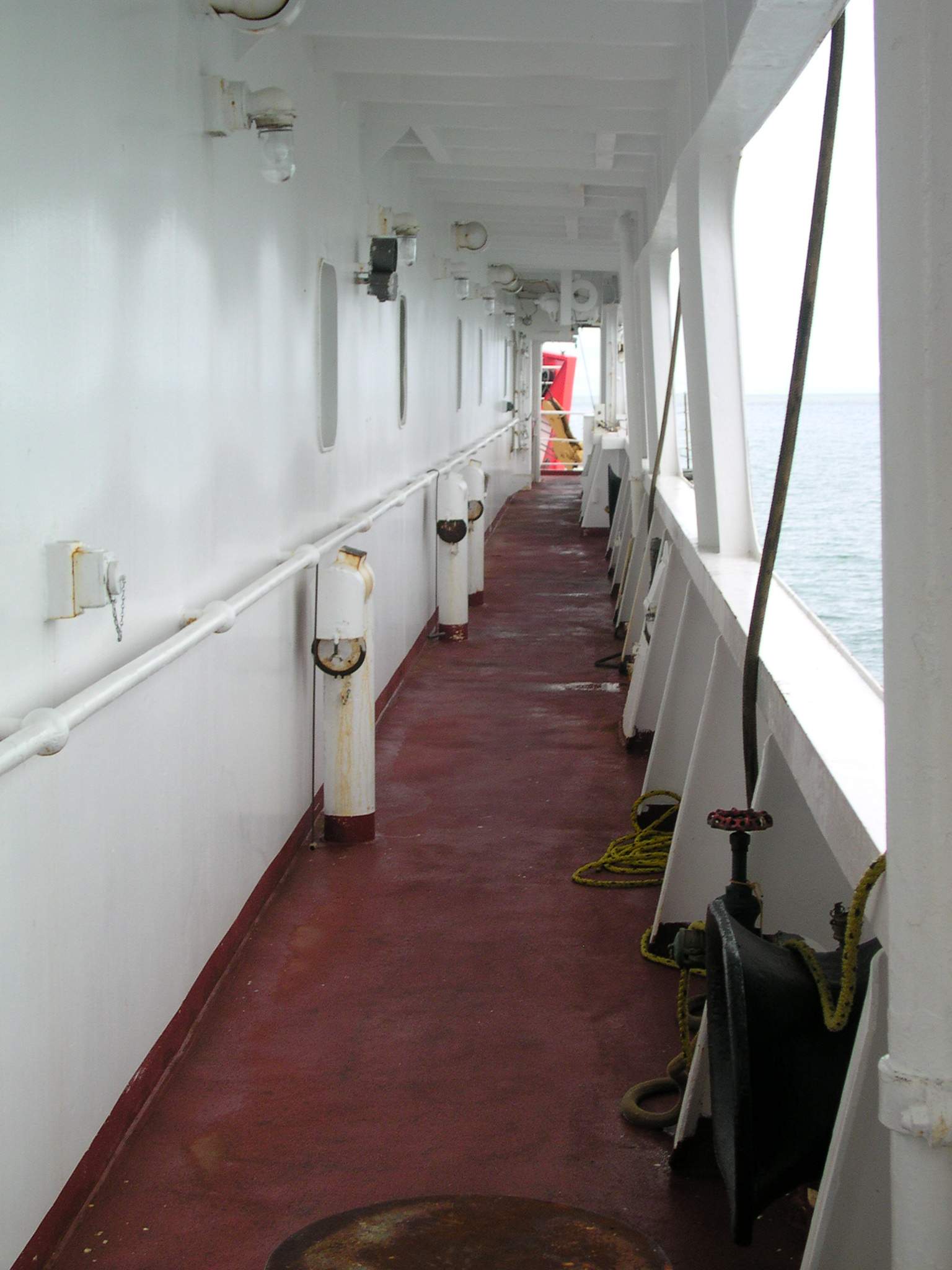 An outside walkway on the Canadian Coast Guard Icebreaker Sir Wilfrid Laurier.