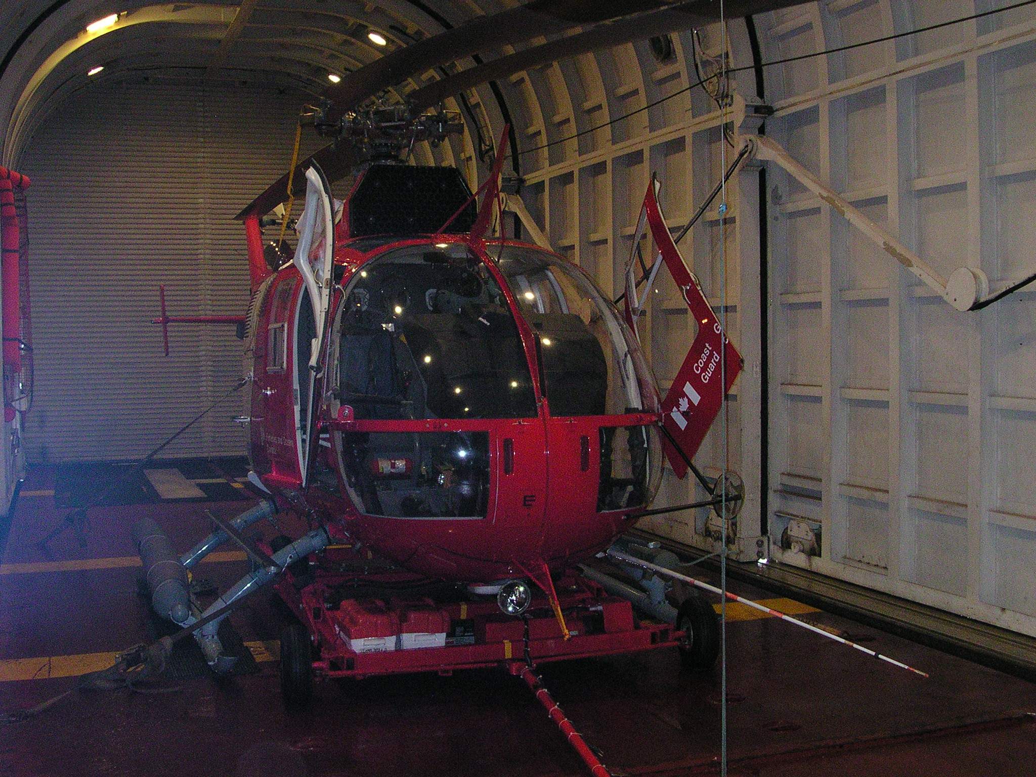 A helicopter in the hanger on board the Canadian Coast Guard Icebreaker Sir Wilfrid Laurier.