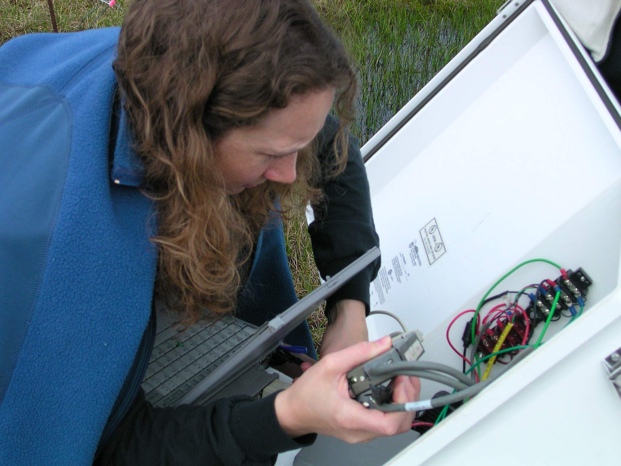TREC teacher Misty Nikula-Ohlsen downloading data from a tower at the Barrow Environmental Observatory (BEO) near Barrow, Alaska.