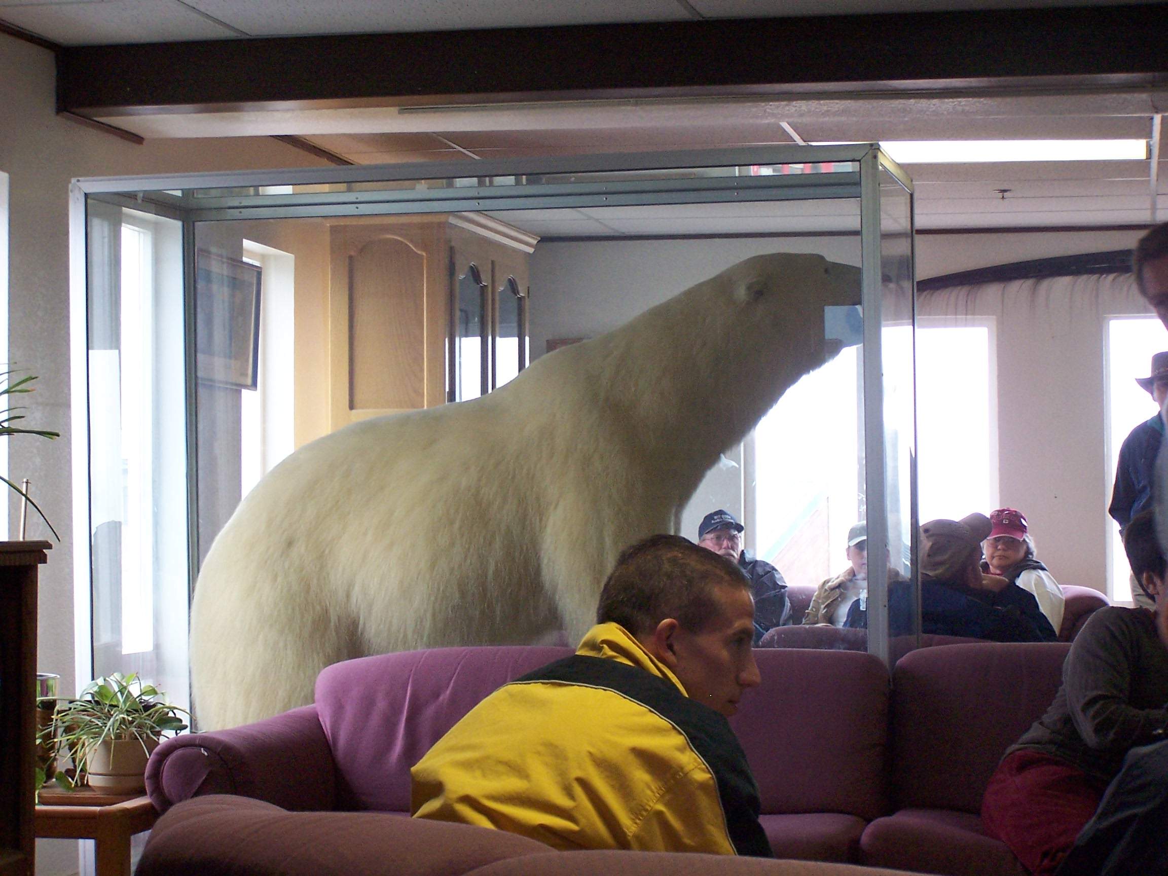 A stuffed polar bear in the lobby of a hotel in Barrow, Alaska.
