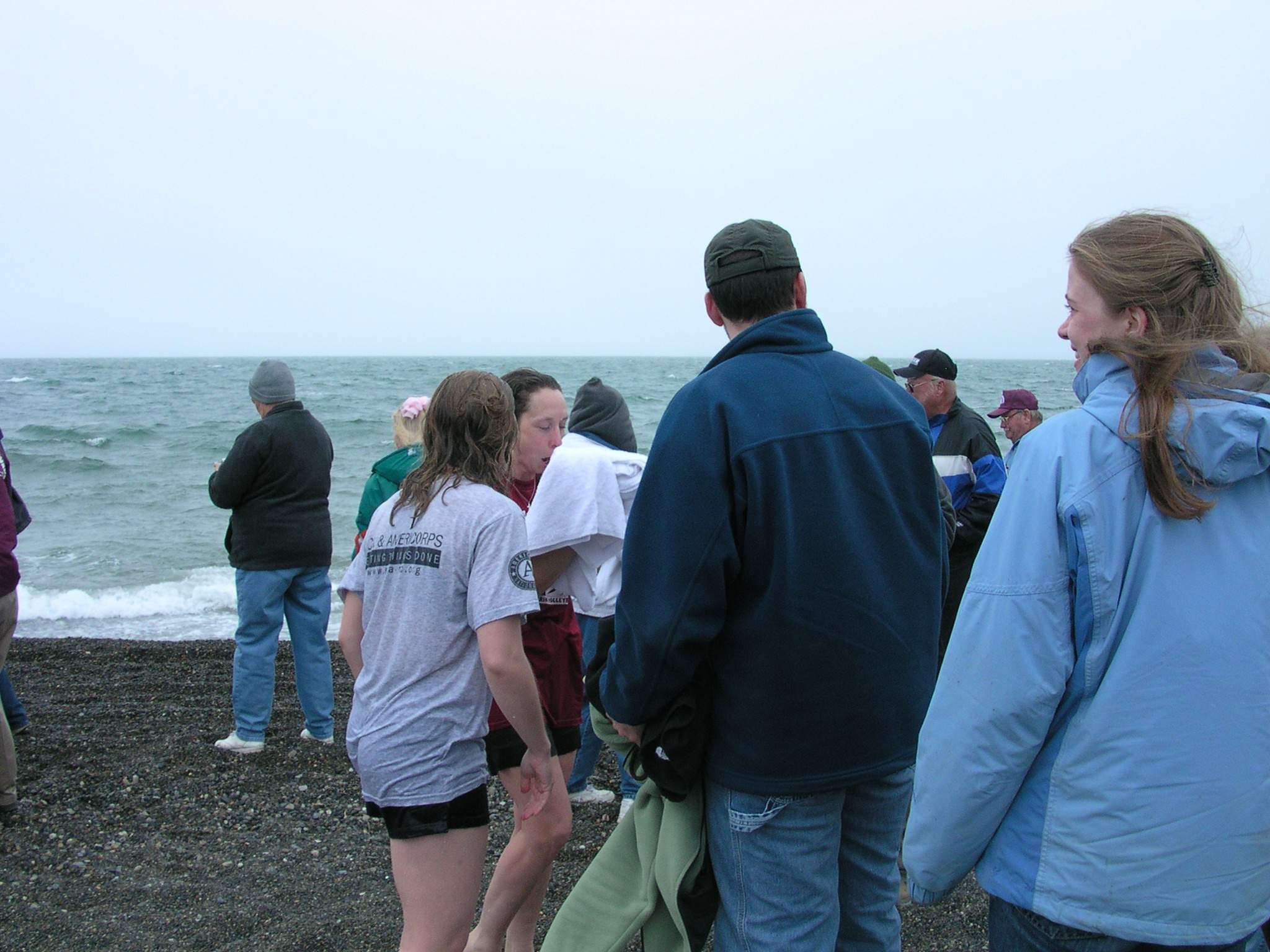 TREC teacher Misty Nikula-Ohlsen and Jenny Richards dry off after their polar bear swim in the Arctic ocean near Barrow, Alaska.