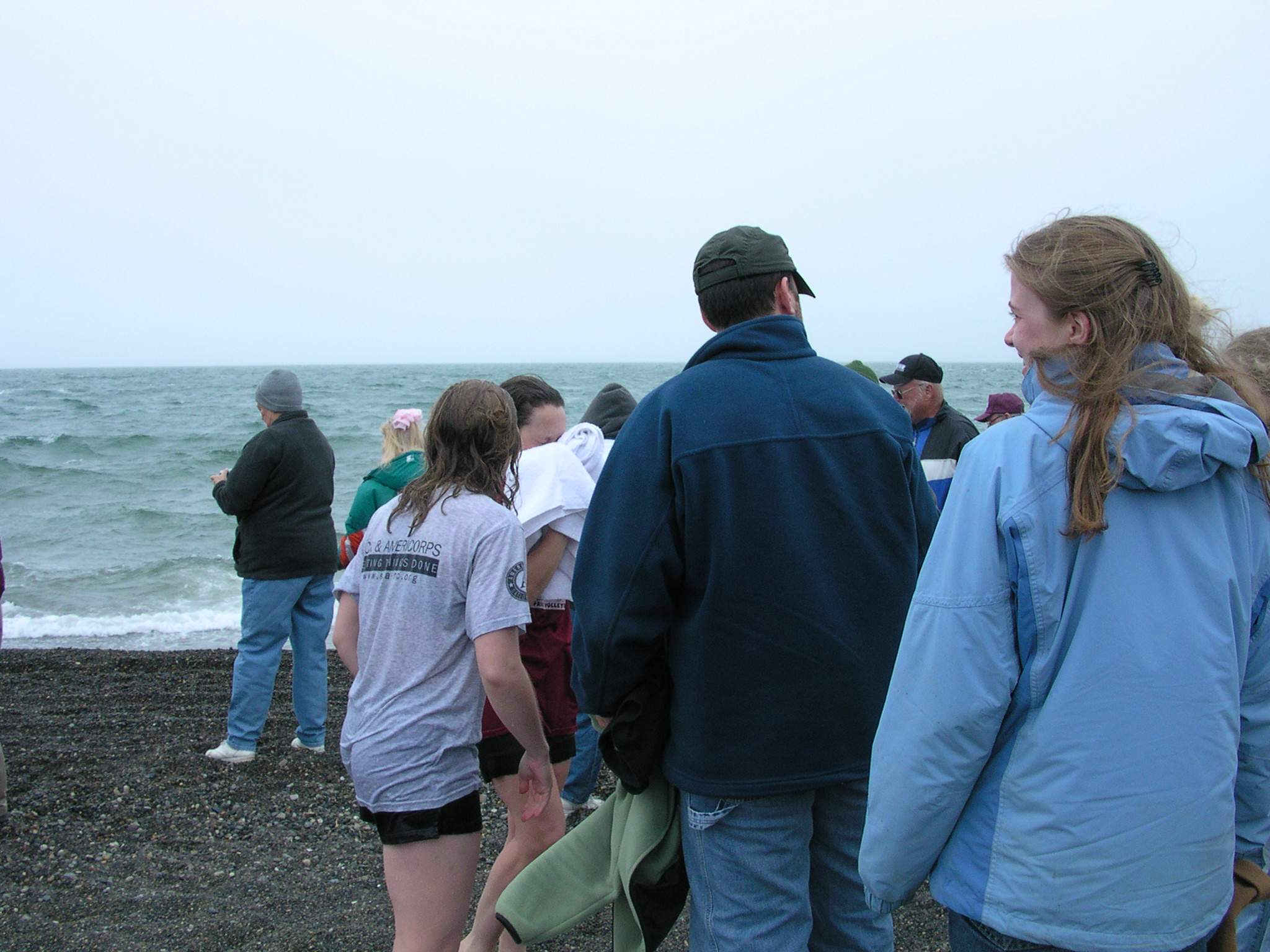 TREC teacher Misty Nikula-Ohlsen and Jenny Richards dry off after their polar bear swim in the Arctic ocean near Barrow, Alaska.