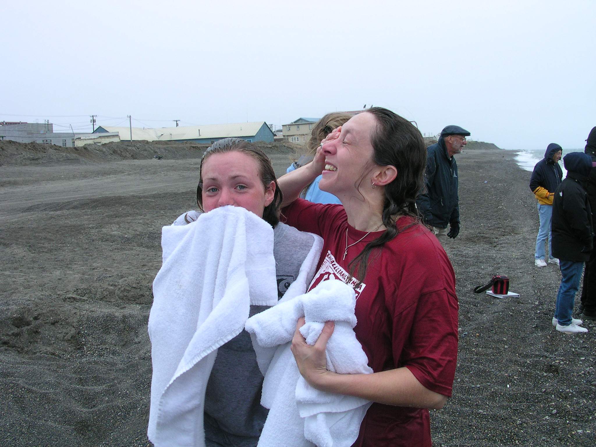 TREC teacher Misty Nikula-Ohlsen and Jenny Richards after their dip, or polar bear swim, in the Arctic Ocean.